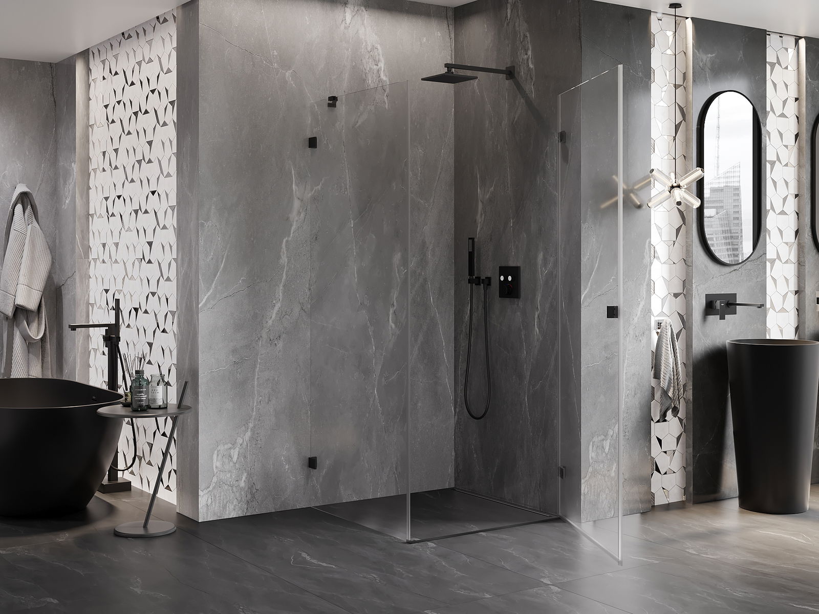 La poignée pratique et confortable est fabriquée en métal durable et résistant. Sa forme à la mode, combinée à une finition assortie à la couleur des profilés, donne à l'ensemble un aspect moderne et stylé, soulignant l'esthétique de chaque salle de bain.