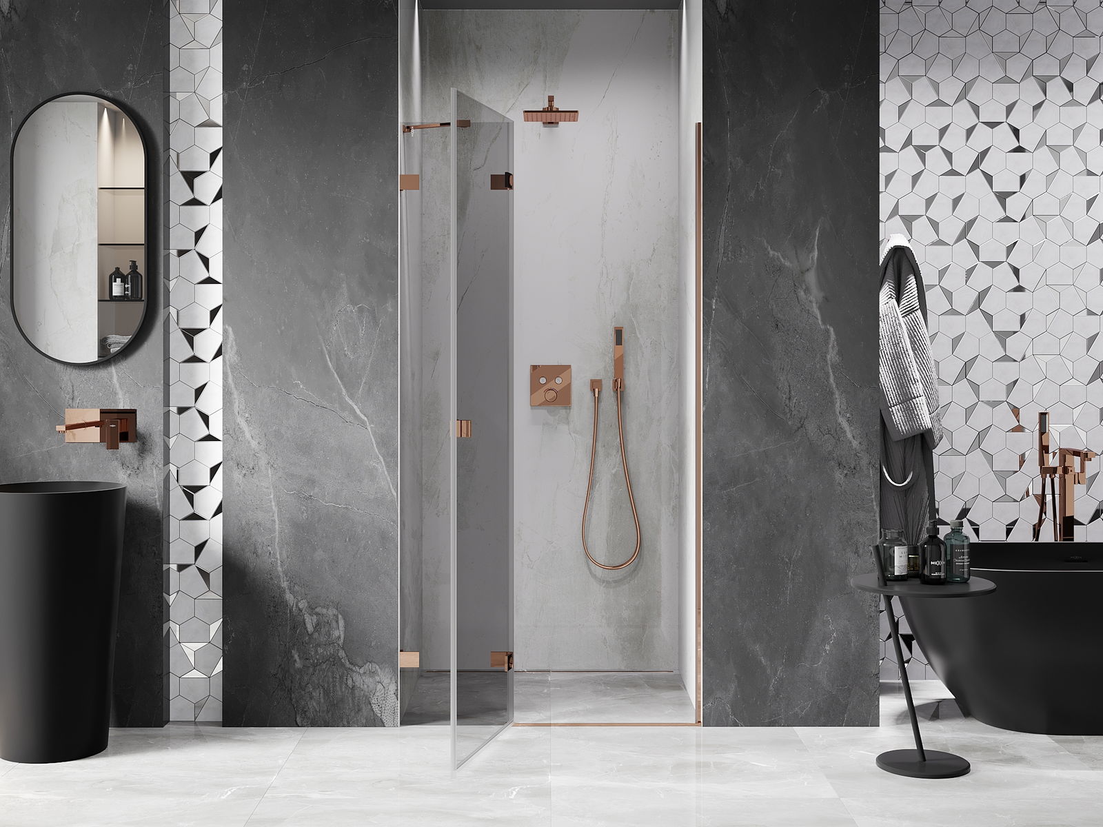 La poignée pratique et confortable est fabriquée en métal durable et résistant. Sa forme à la mode, combinée à une finition assortie à la couleur des profilés, donne à l'ensemble un aspect moderne et stylé, soulignant l'esthétique de chaque salle de bain.