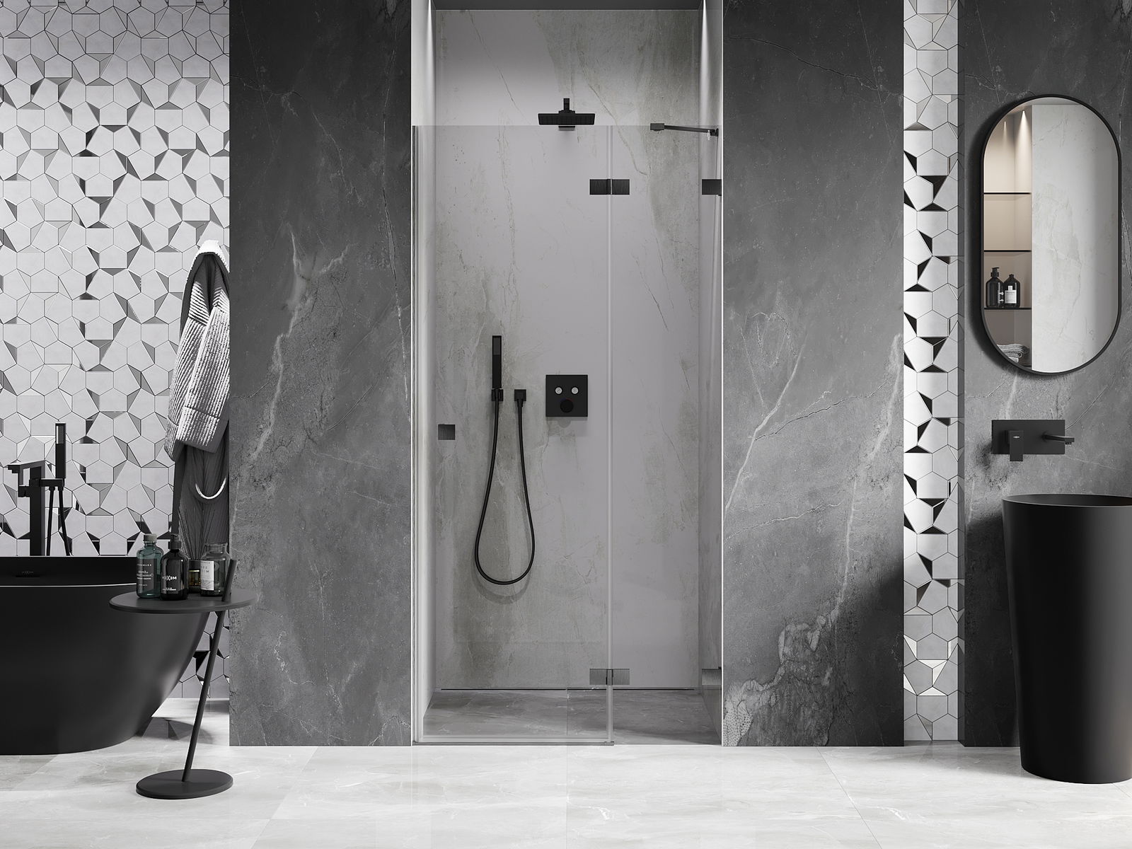La poignée pratique et confortable est fabriquée en métal durable et résistant. Sa forme à la mode, combinée à une finition assortie à la couleur des profilés, donne à l'ensemble un aspect moderne et stylé, soulignant l'esthétique de chaque salle de bain.