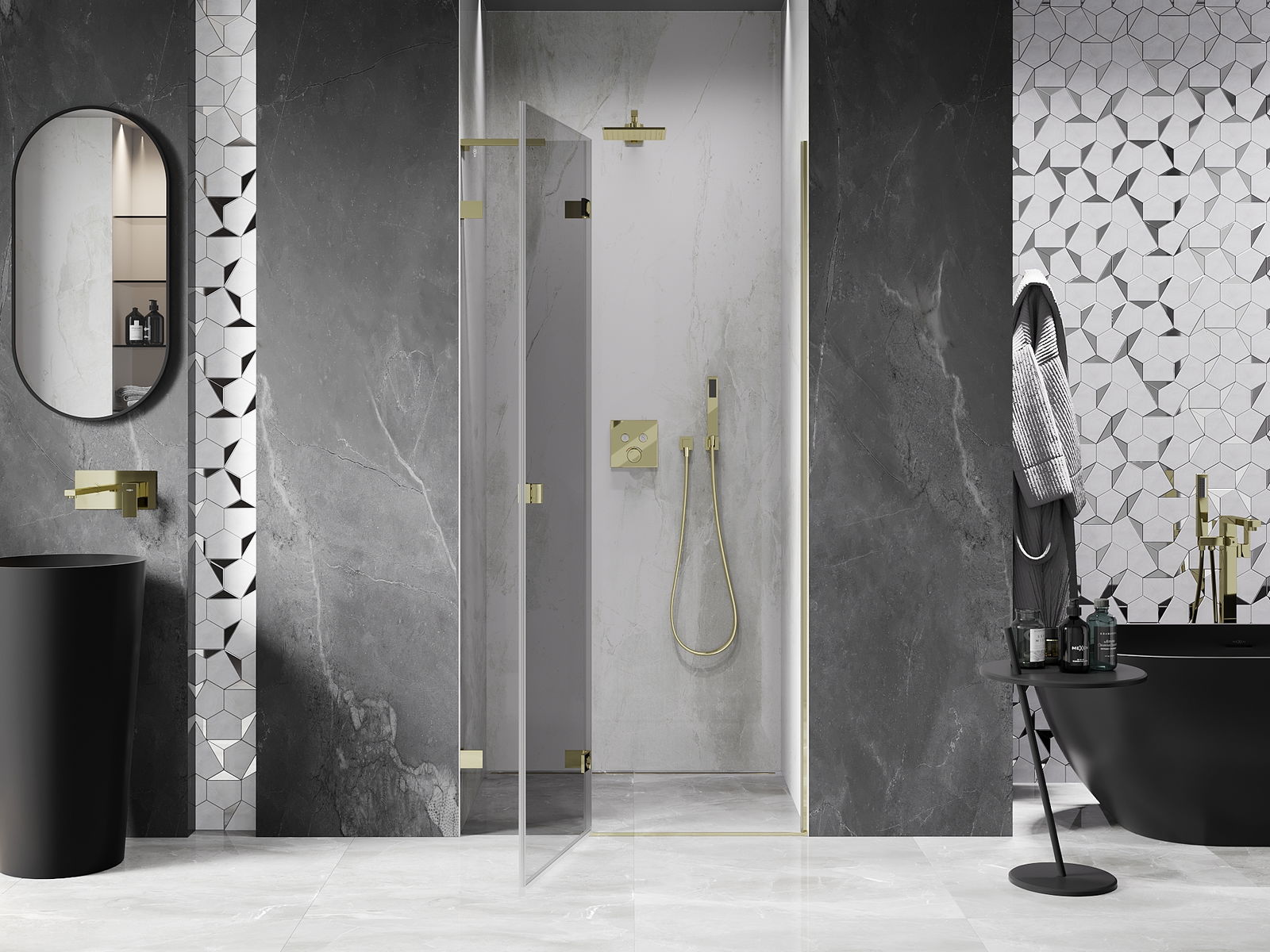 La poignée pratique et confortable est fabriquée en métal durable et résistant. Sa forme à la mode, combinée à une finition assortie à la couleur des profilés, donne à l'ensemble un aspect moderne et stylé, soulignant l'esthétique de chaque salle de bain.