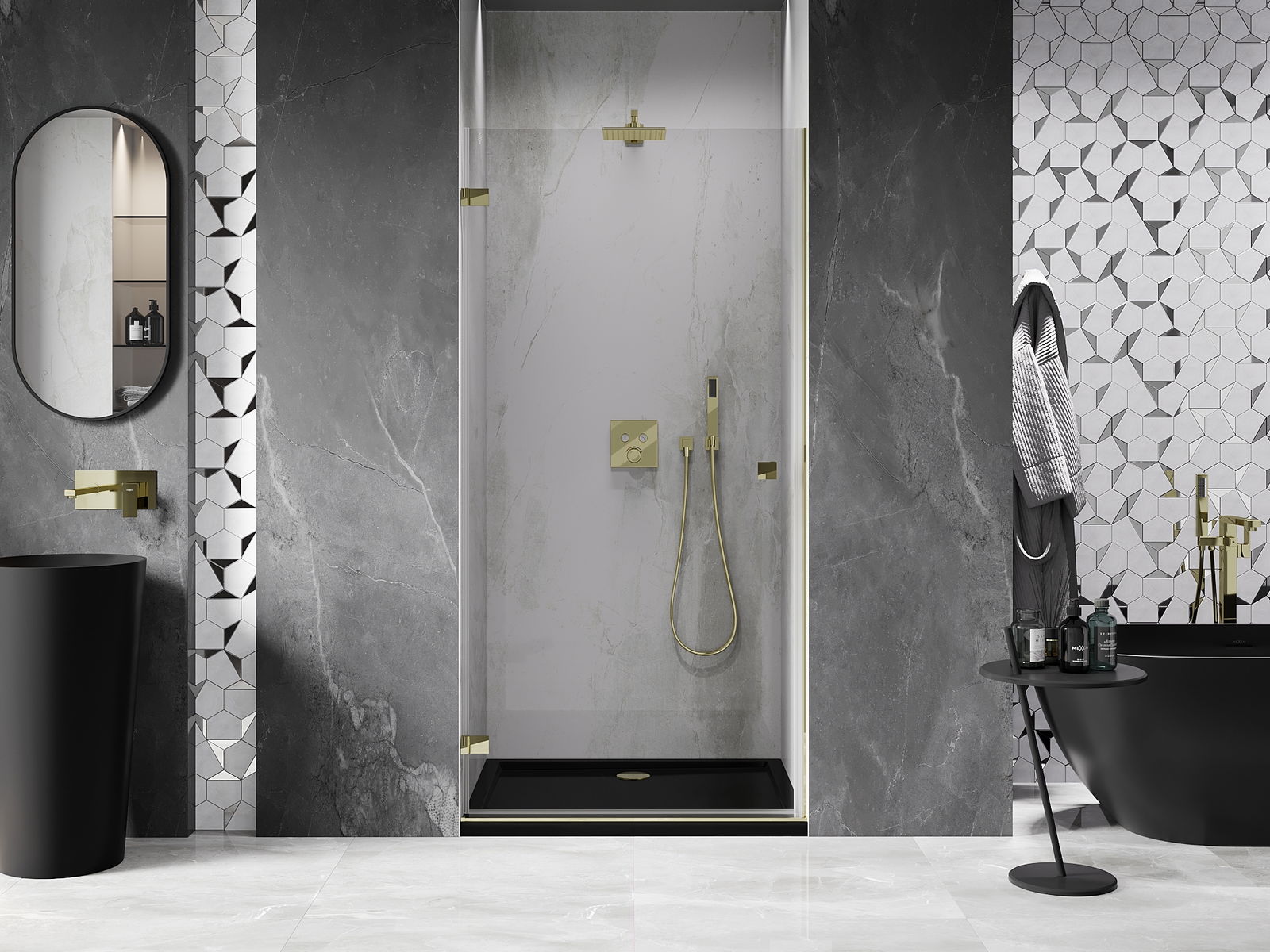 La poignée pratique et confortable est fabriquée en métal durable et résistant. Sa forme à la mode, combinée à une finition assortie à la couleur des profilés, donne à l'ensemble un aspect moderne et stylé, soulignant l'esthétique de chaque salle de bain.