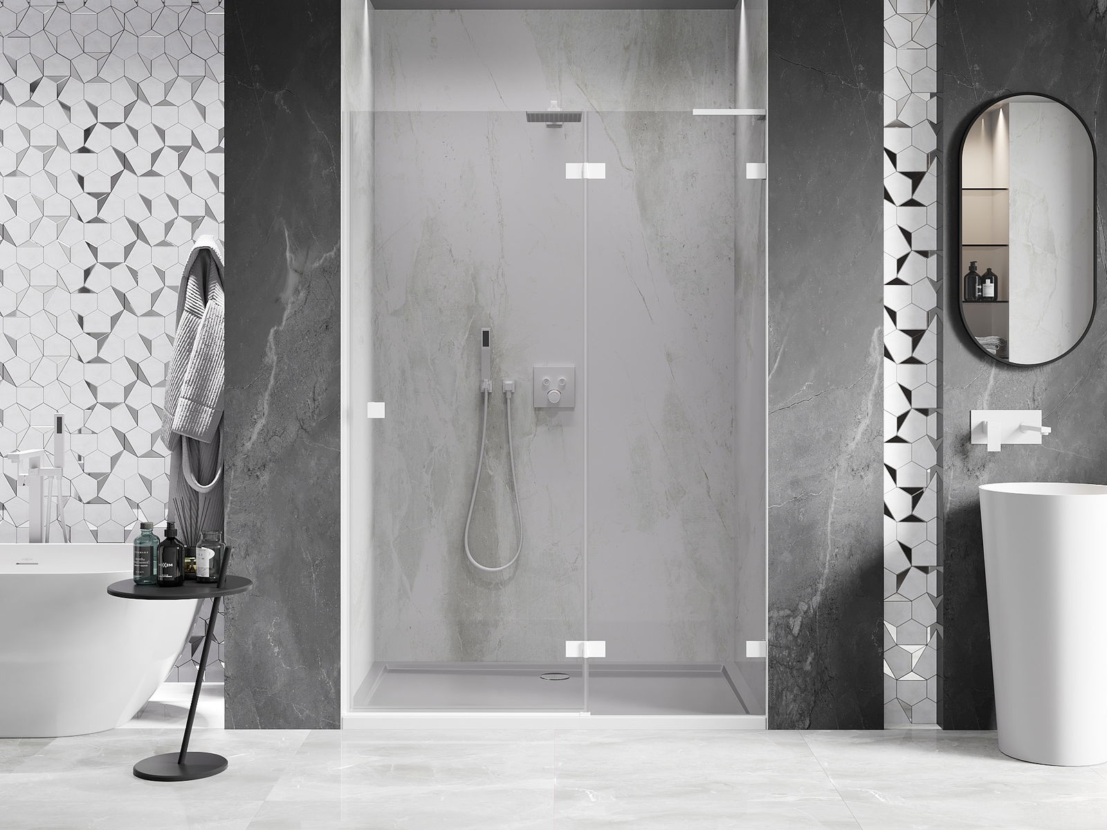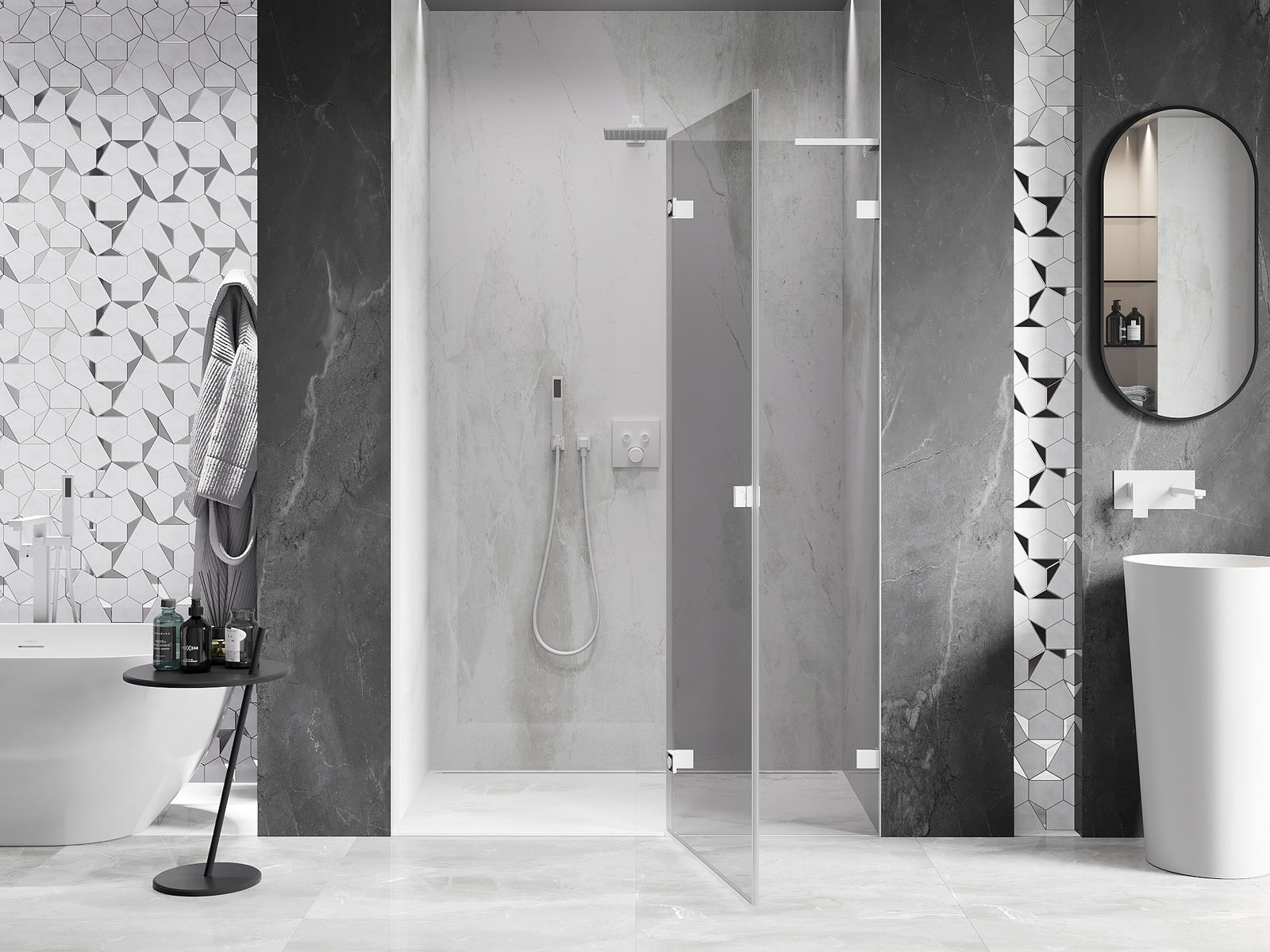 La poignée pratique et confortable est fabriquée en métal durable et résistant. Sa forme à la mode, combinée à une finition assortie à la couleur des profilés, donne à l'ensemble un aspect moderne et stylé, soulignant l'esthétique de chaque salle de bain.