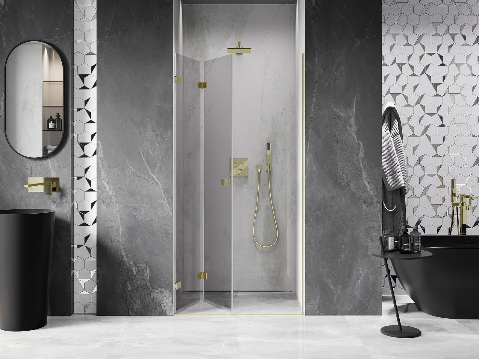 La poignée pratique et confortable est fabriquée en métal durable et résistant. Sa forme à la mode, combinée à une finition assortie à la couleur des profilés, donne à l'ensemble un aspect moderne et stylé, soulignant l'esthétique de chaque salle de bain.