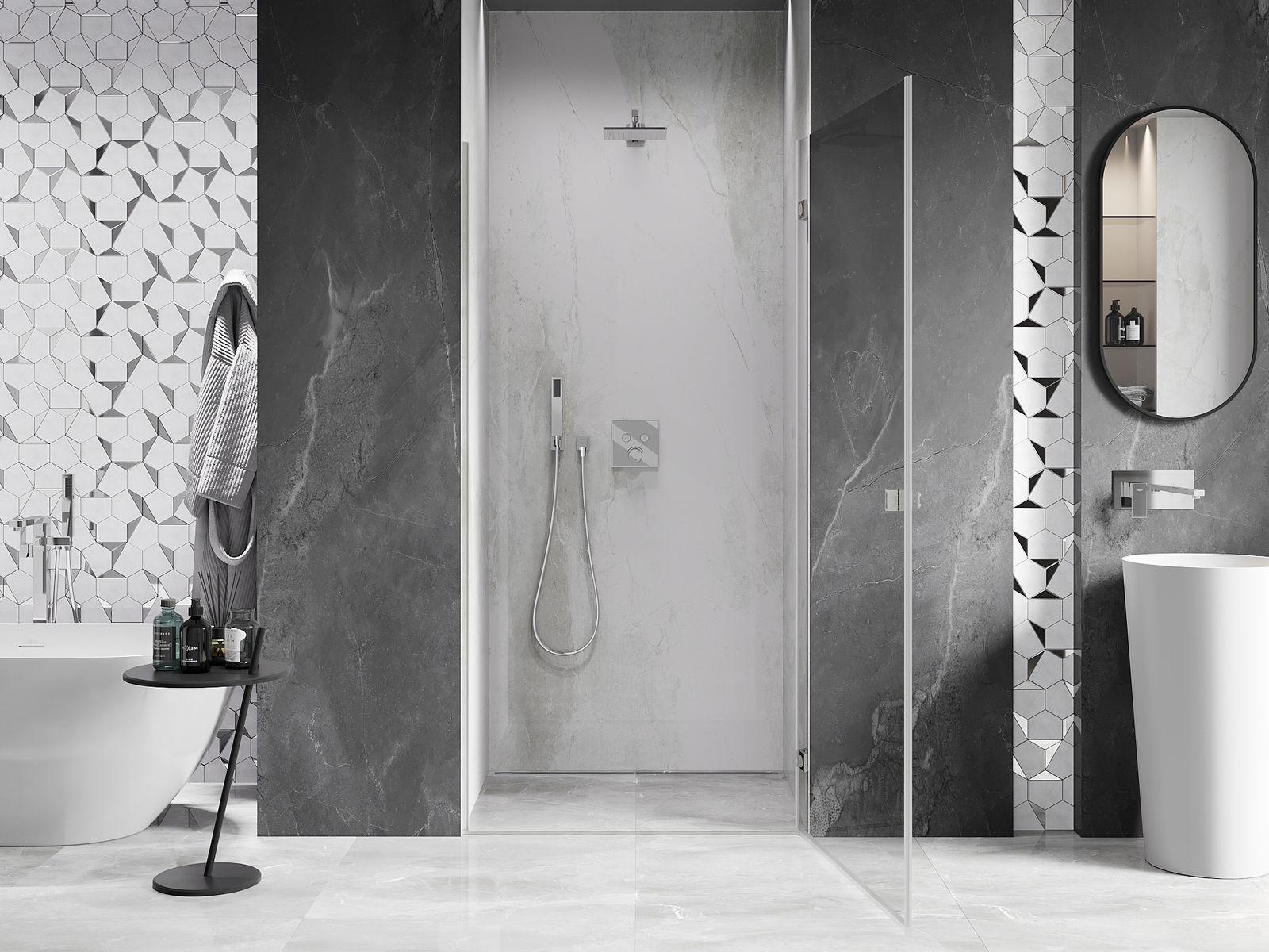 La poignée pratique et confortable est fabriquée en métal durable et résistant. Sa forme à la mode, combinée à une finition assortie à la couleur des profilés, donne à l'ensemble un aspect moderne et stylé, soulignant l'esthétique de chaque salle de bain.