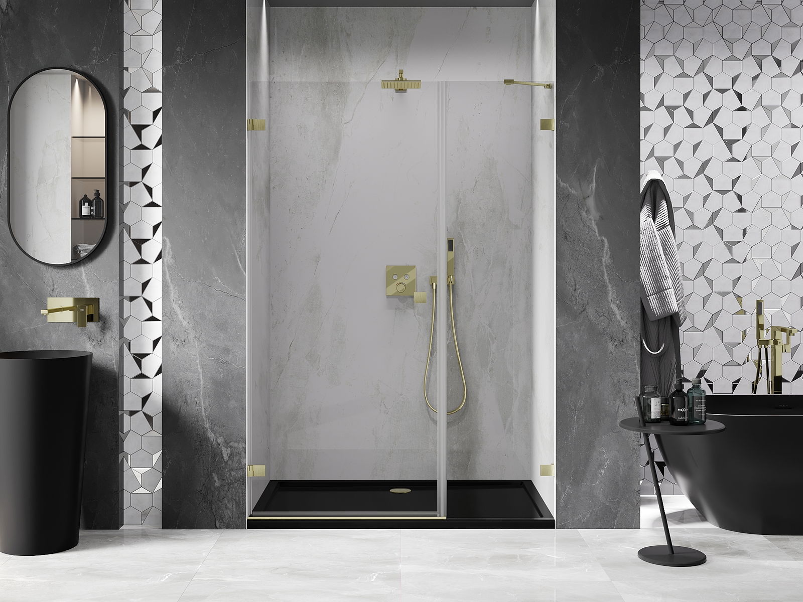 La poignée pratique et confortable est fabriquée en métal durable et résistant. Sa forme à la mode, combinée à une finition assortie à la couleur des profilés, donne à l'ensemble un aspect moderne et stylé, soulignant l'esthétique de chaque salle de bain.