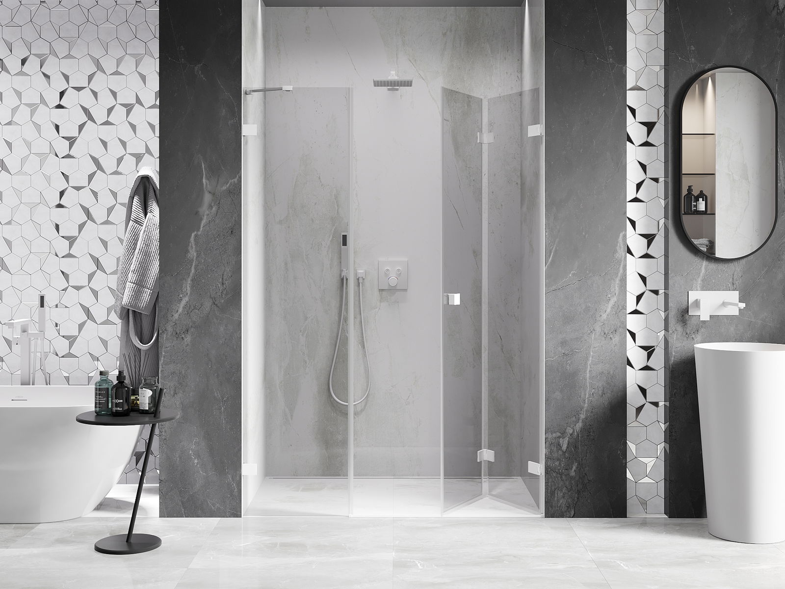 La poignée pratique et confortable est fabriquée en métal durable et résistant. Sa forme à la mode, combinée à une finition assortie à la couleur des profilés, donne à l'ensemble un aspect moderne et stylé, soulignant l'esthétique de chaque salle de bain.