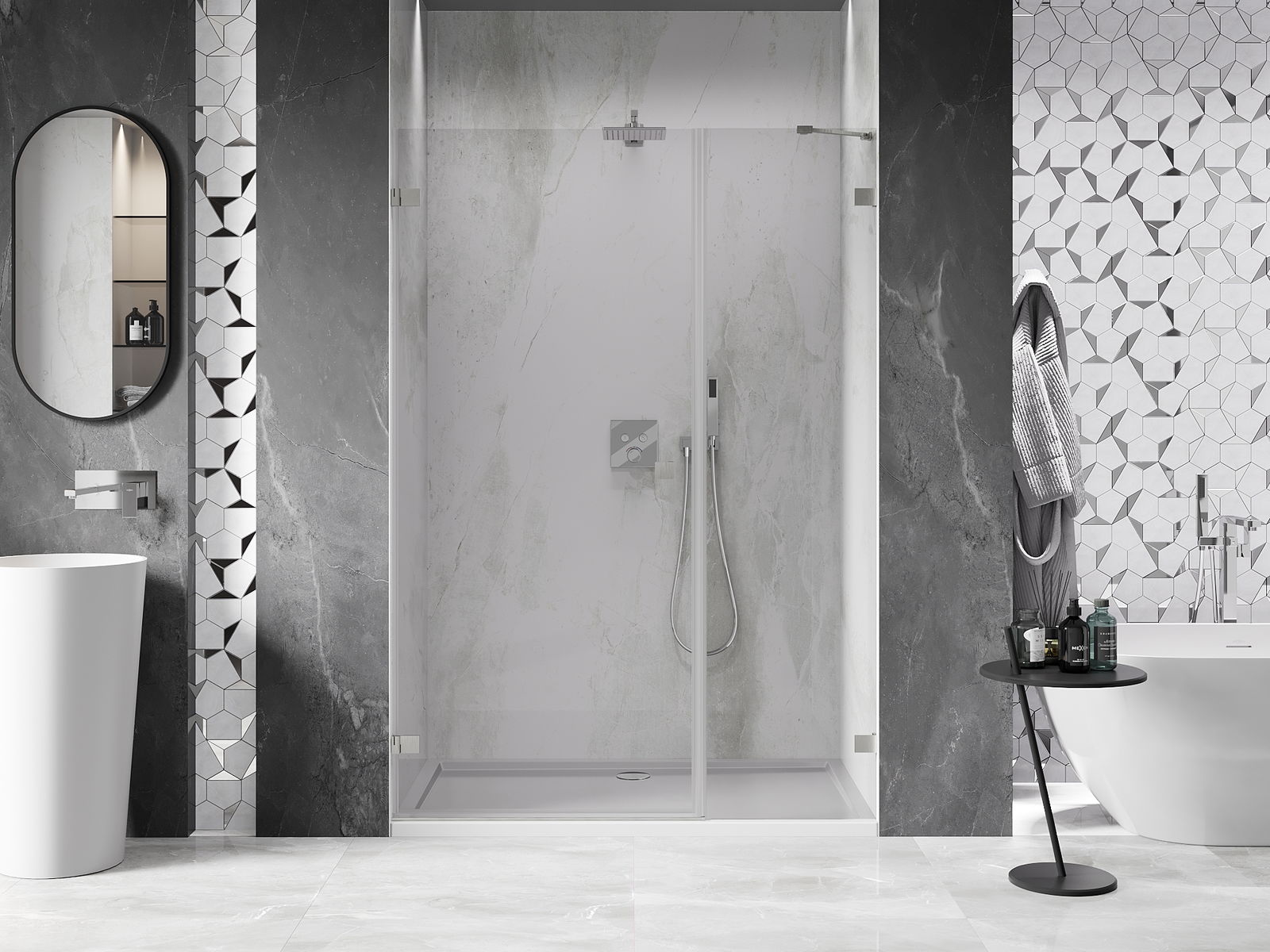 La poignée pratique et confortable est fabriquée en métal durable et résistant. Sa forme à la mode, combinée à une finition assortie à la couleur des profilés, donne à l'ensemble un aspect moderne et stylé, soulignant l'esthétique de chaque salle de bain.