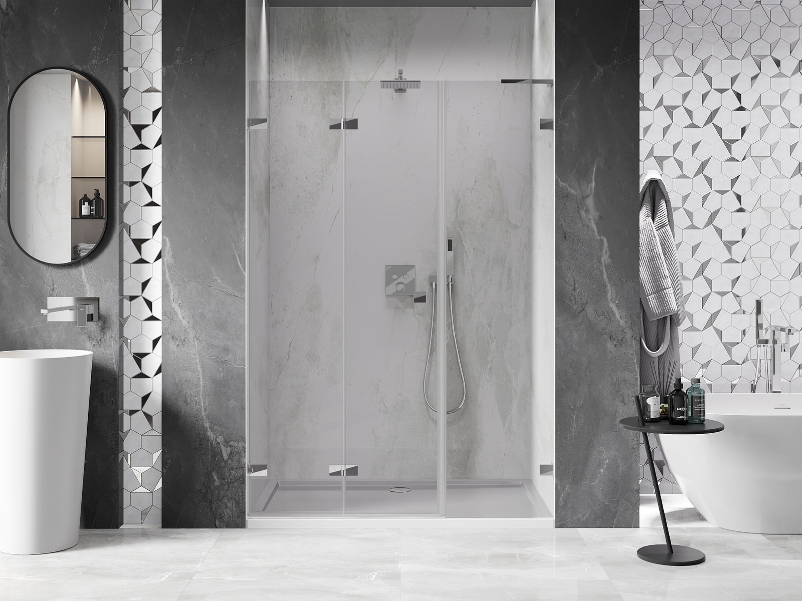 La poignée pratique et confortable est fabriquée en métal durable et résistant. Sa forme à la mode, combinée à une finition assortie à la couleur des profilés, donne à l'ensemble un aspect moderne et stylé, soulignant l'esthétique de chaque salle de bain.