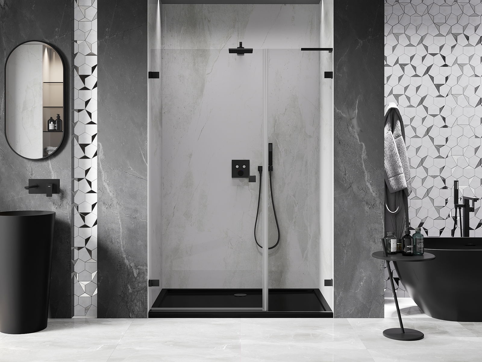 La poignée pratique et confortable est fabriquée en métal durable et résistant. Sa forme à la mode, combinée à une finition assortie à la couleur des profilés, donne à l'ensemble un aspect moderne et stylé, soulignant l'esthétique de chaque salle de bain.
