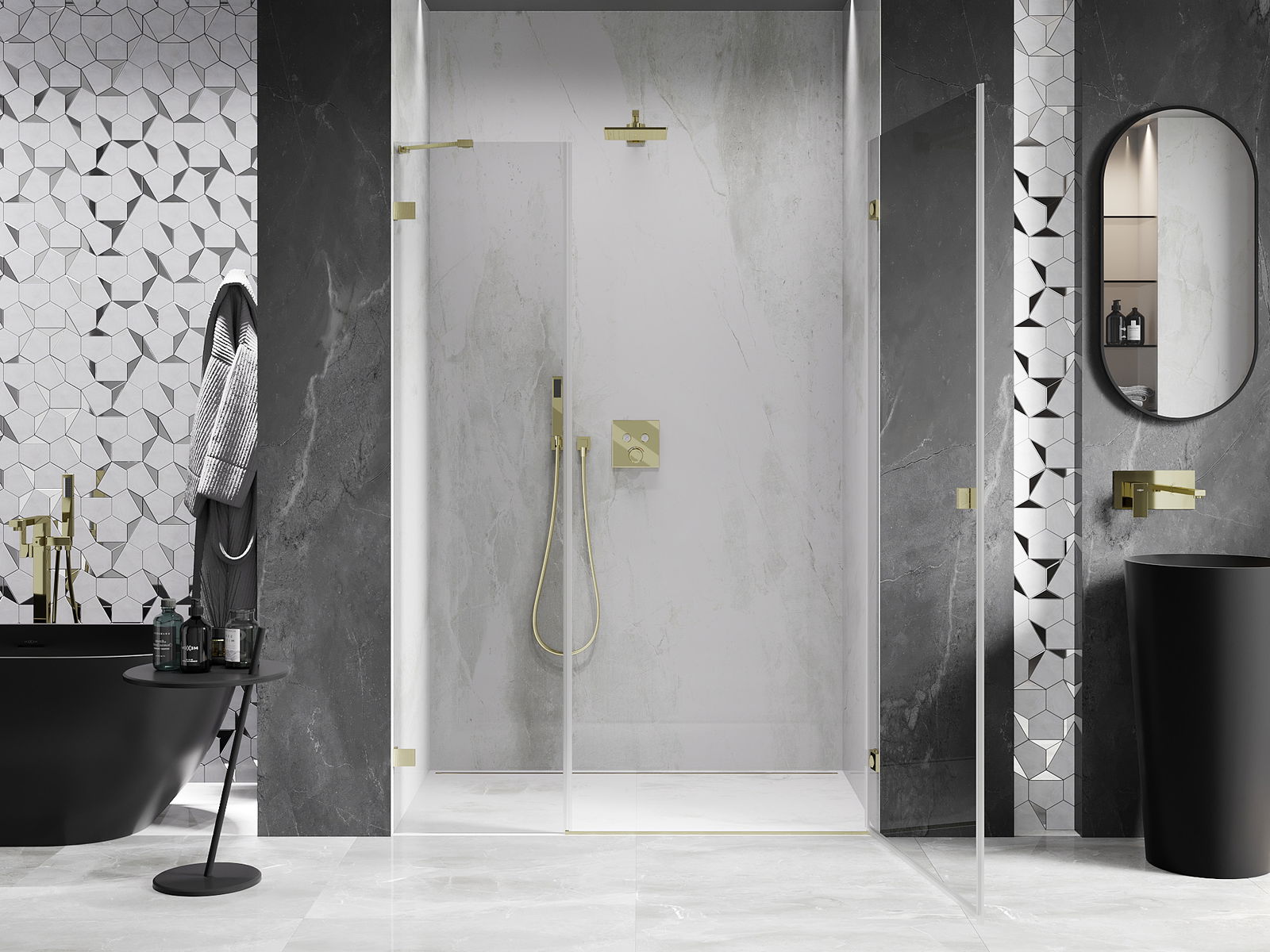 La poignée pratique et confortable est fabriquée en métal durable et résistant. Sa forme à la mode, combinée à une finition assortie à la couleur des profilés, donne à l'ensemble un aspect moderne et stylé, soulignant l'esthétique de chaque salle de bain.