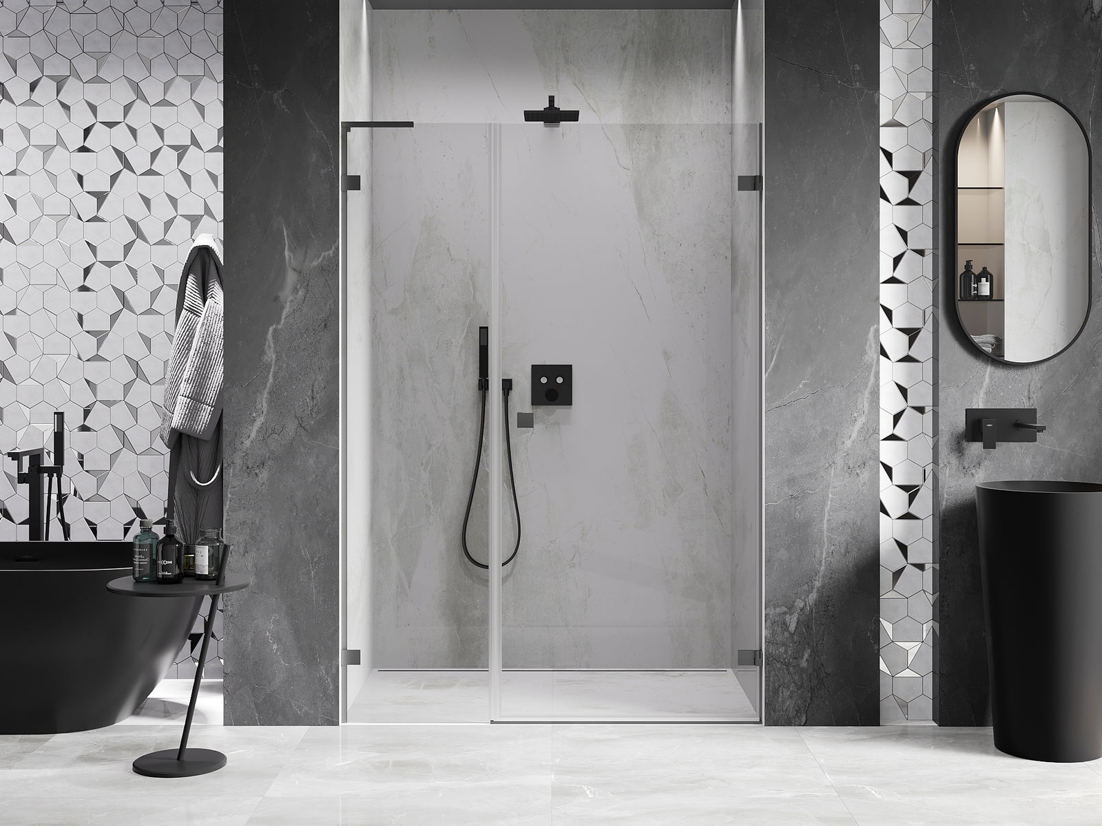 La poignée pratique et confortable est fabriquée en métal durable et résistant. Sa forme à la mode, combinée à une finition assortie à la couleur des profilés, donne à l'ensemble un aspect moderne et stylé, soulignant l'esthétique de chaque salle de bain.