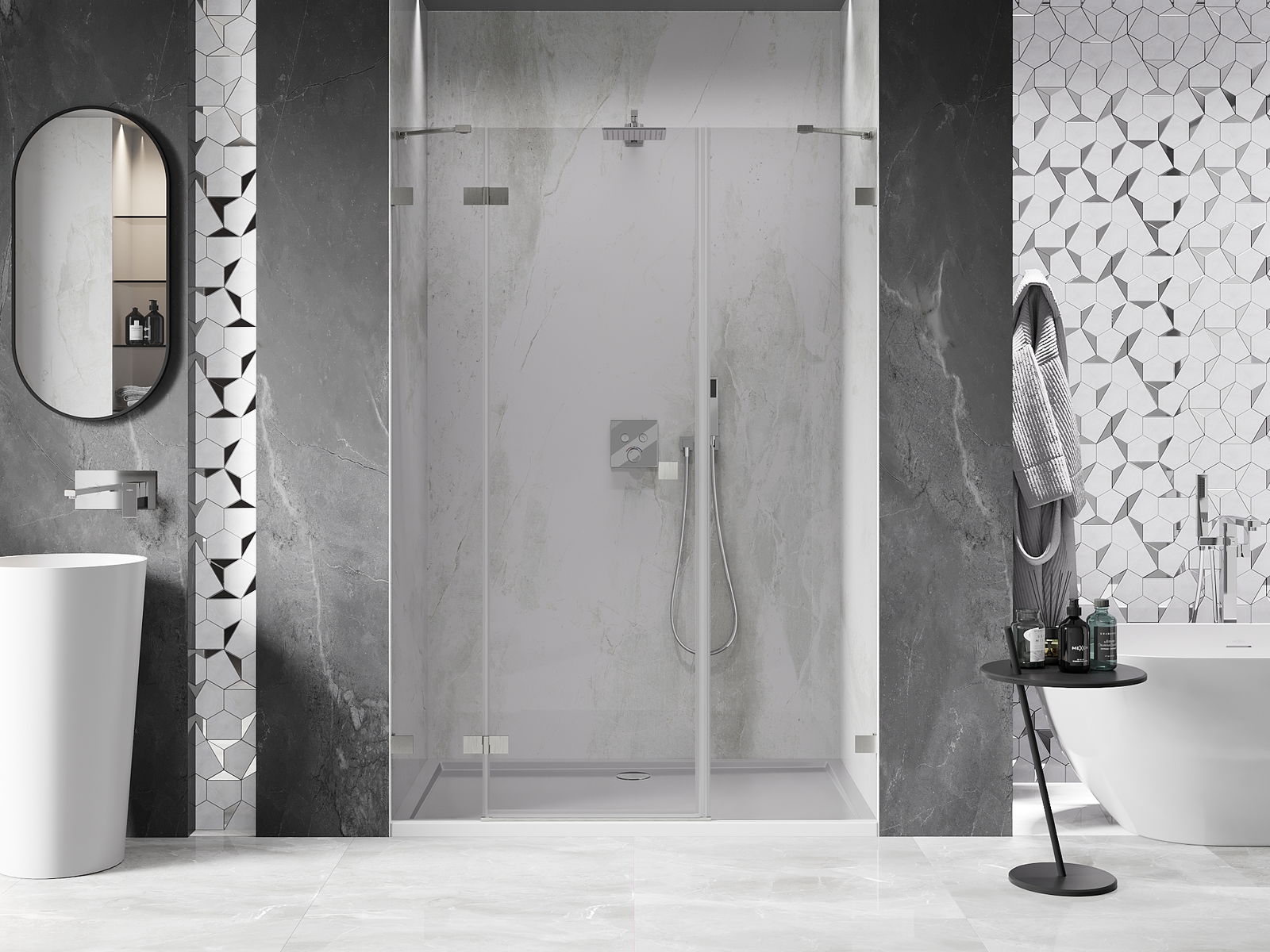 La poignée pratique et confortable est fabriquée en métal durable et résistant. Sa forme à la mode, combinée à une finition assortie à la couleur des profilés, donne à l'ensemble un aspect moderne et stylé, soulignant l'esthétique de chaque salle de bain.