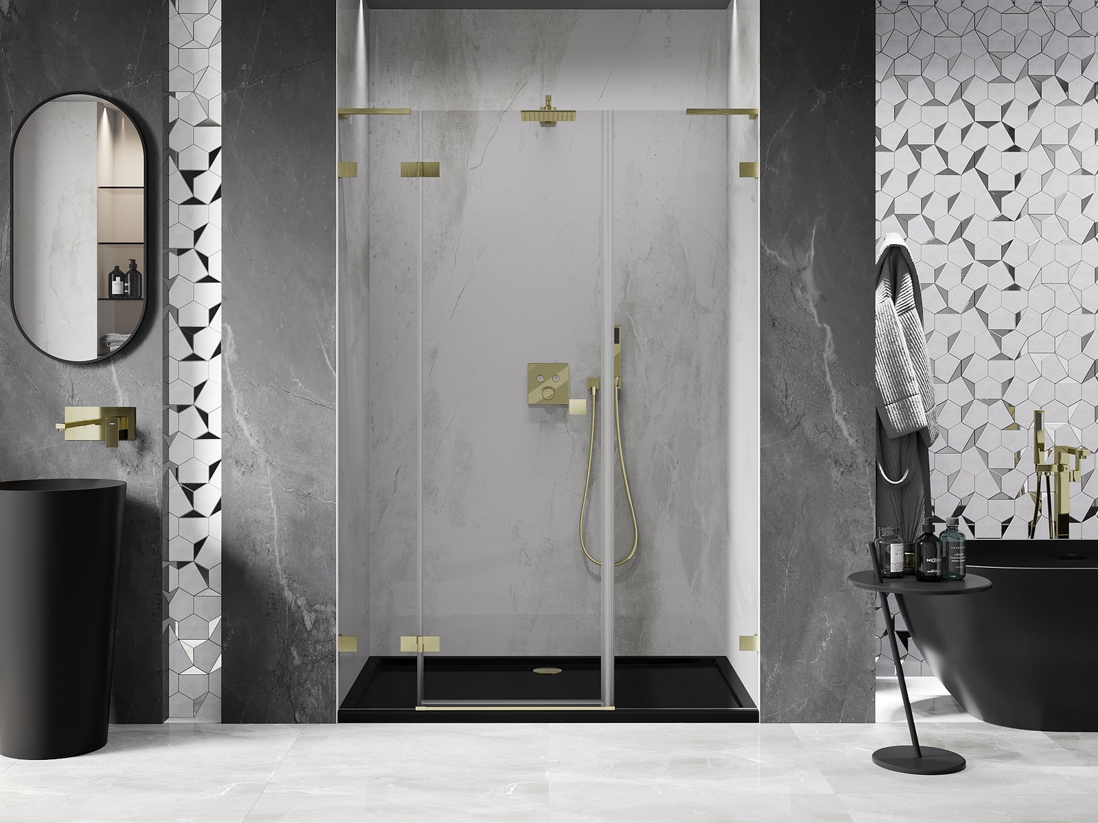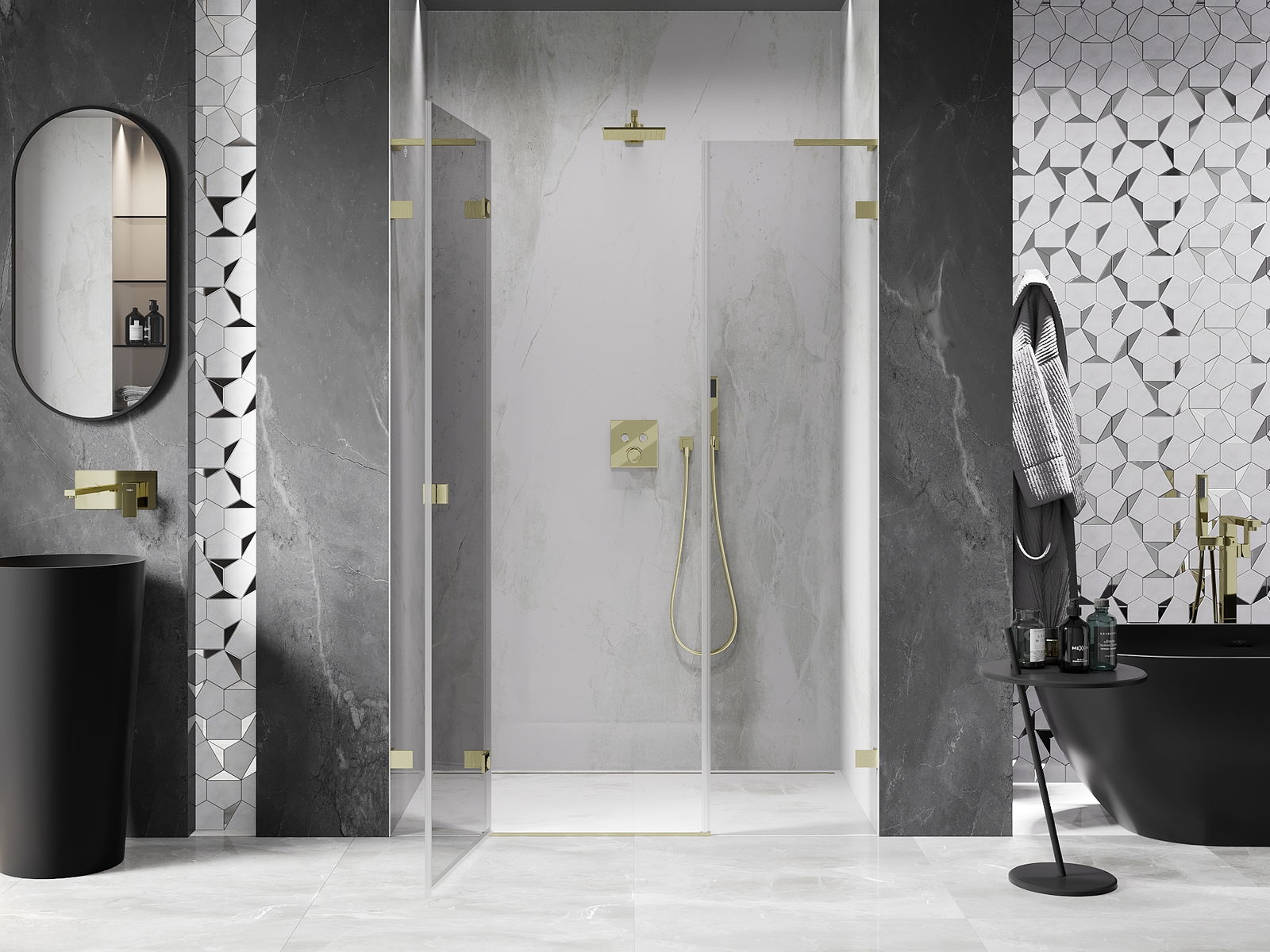 La poignée pratique et confortable est fabriquée en métal durable et résistant. Sa forme à la mode, combinée à une finition assortie à la couleur des profilés, donne à l'ensemble un aspect moderne et stylé, soulignant l'esthétique de chaque salle de bain.