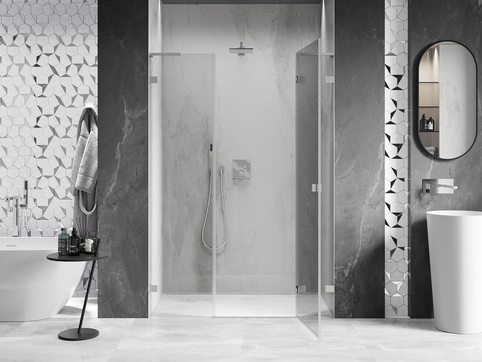 La poignée pratique et confortable est fabriquée en métal durable et résistant. Sa forme à la mode, combinée à une finition assortie à la couleur des profilés, donne à l'ensemble un aspect moderne et stylé, soulignant l'esthétique de chaque salle de bain.