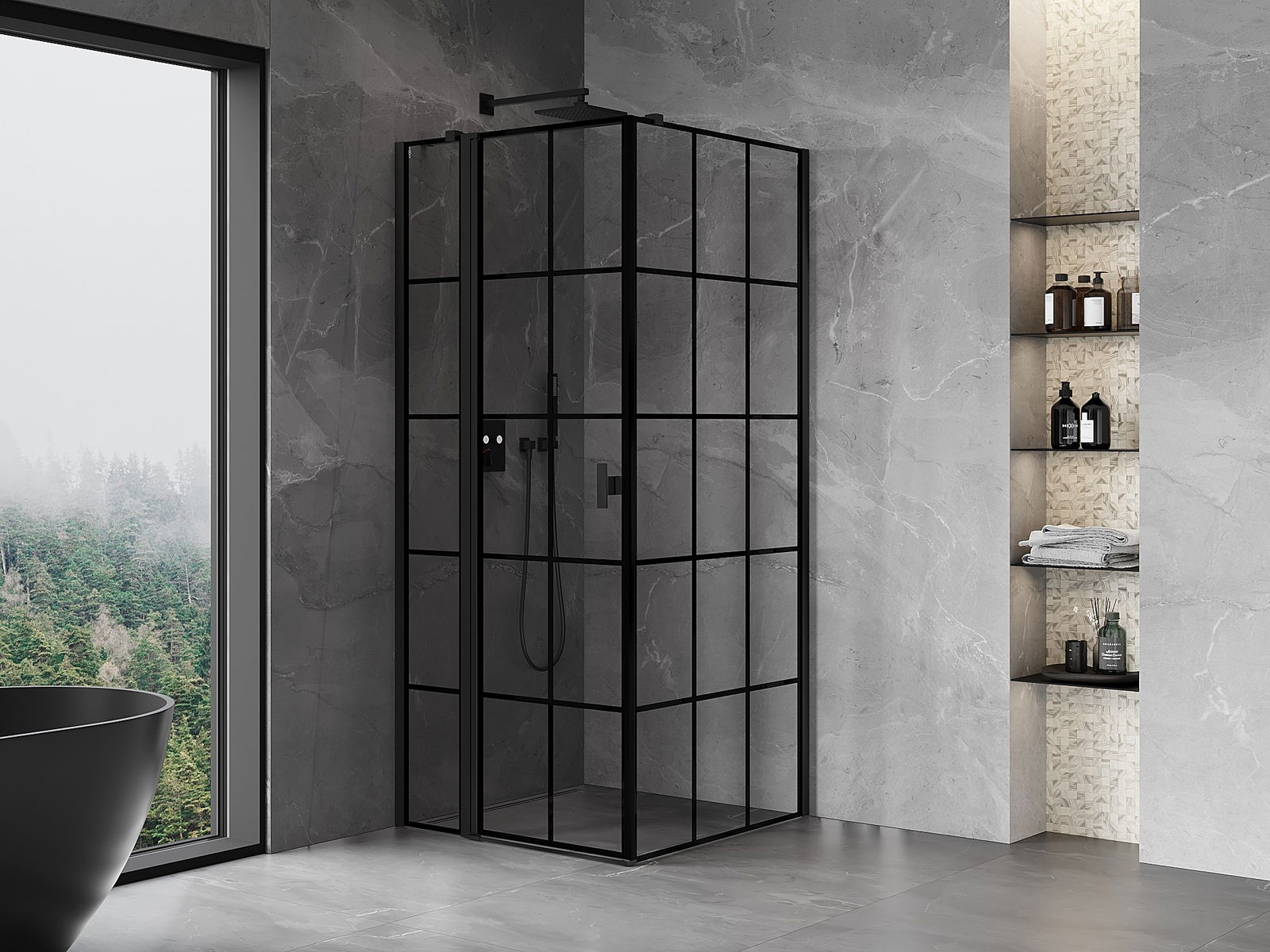 Mexen Mist T cabine de douche pivotante gauche 85 x 85 cm, grille noire, noire - 8A4T-085-085-70-77-L