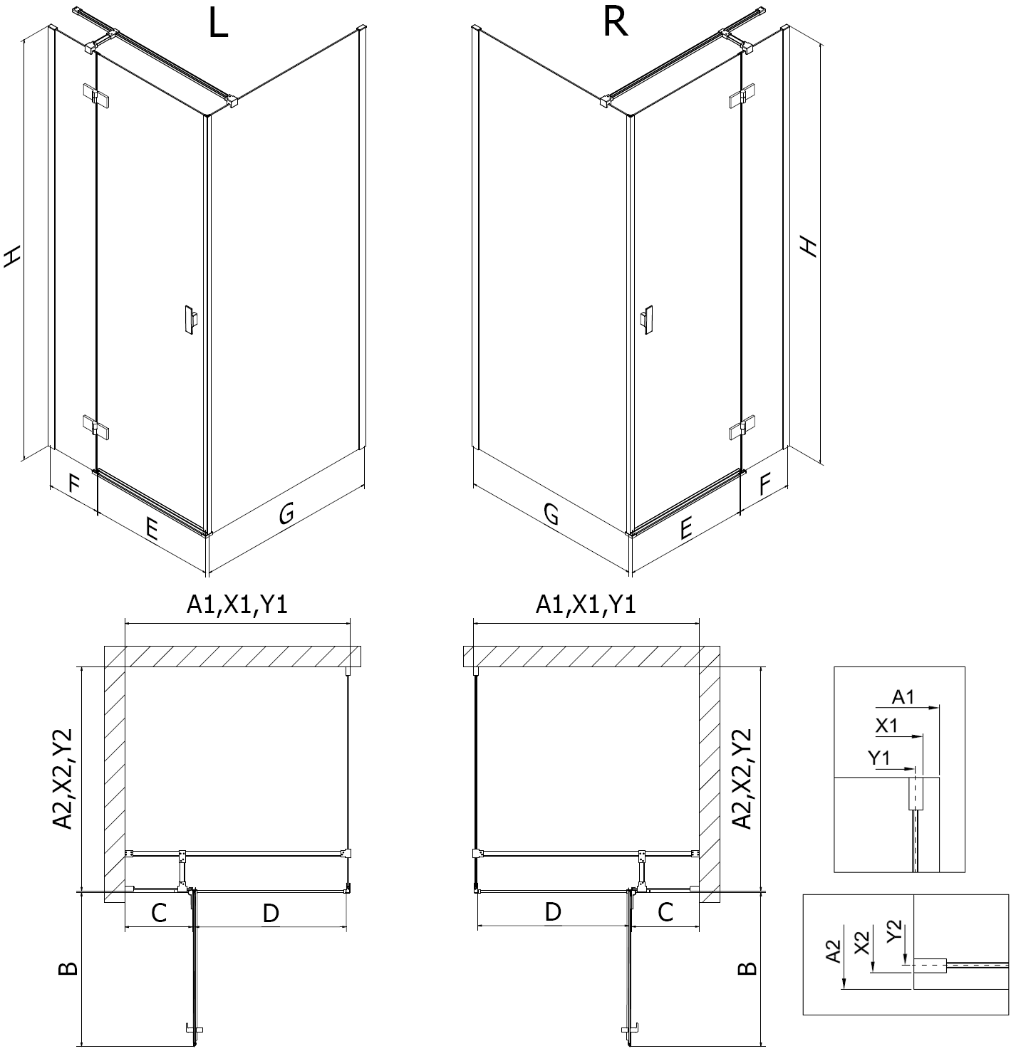 Taille : 75x75 cm (portes gauches 75 cm, paroi 75 cm)