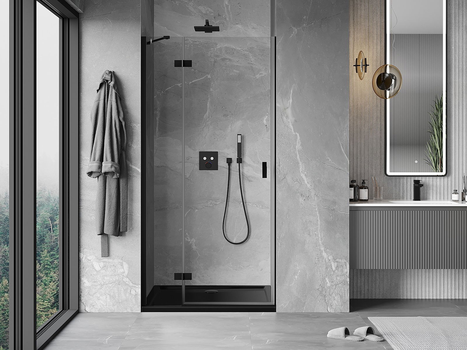 La poignée pratique et confortable est fabriquée en métal durable et résistant. Sa forme à la mode, combinée à une finition assortie à la couleur des profilés, donne à l'ensemble un aspect moderne et stylé, soulignant l'esthétique de chaque salle de bain.