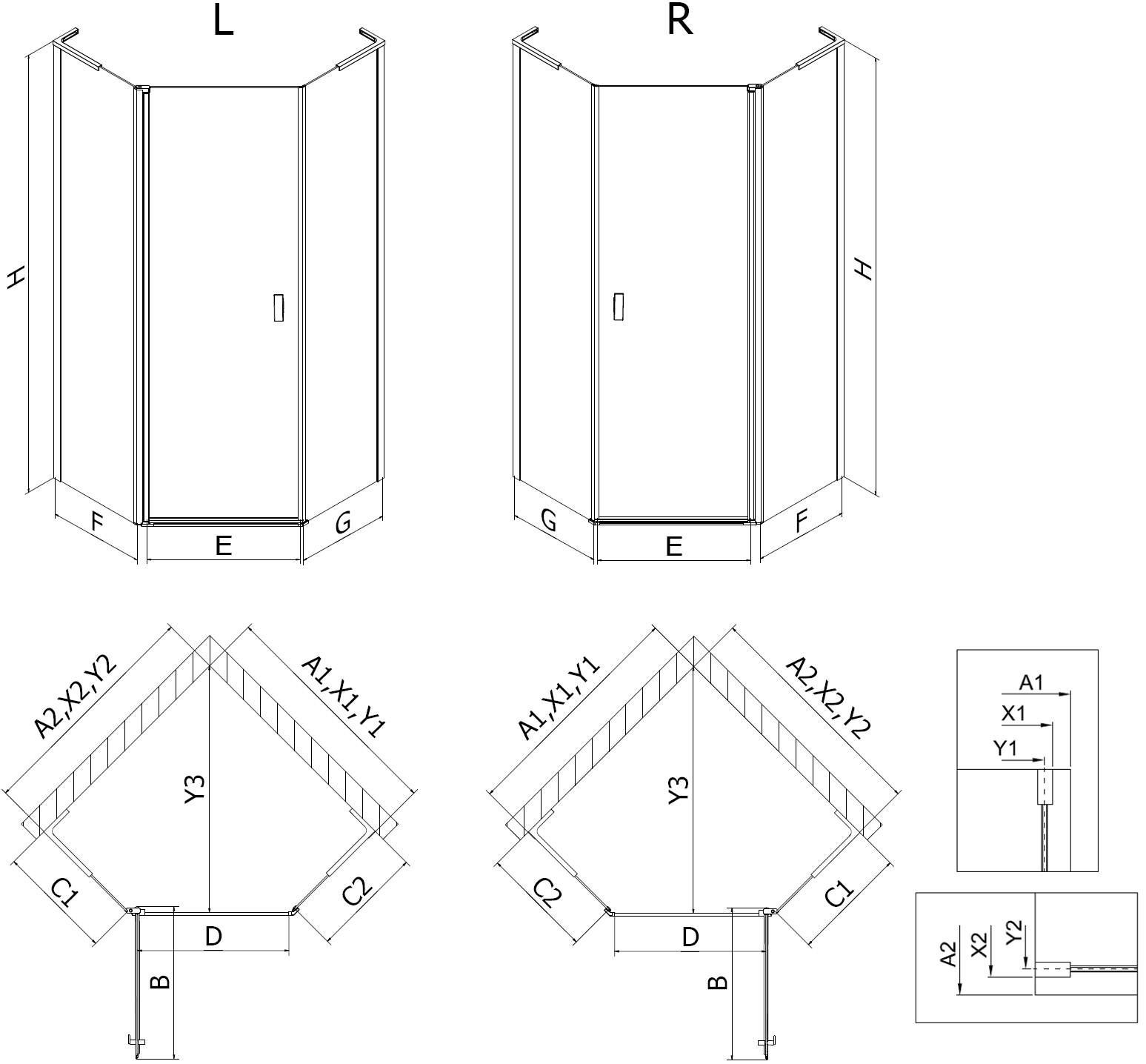 Taille: 90x90 cm (porte 90 cm, paroi 90 cm)