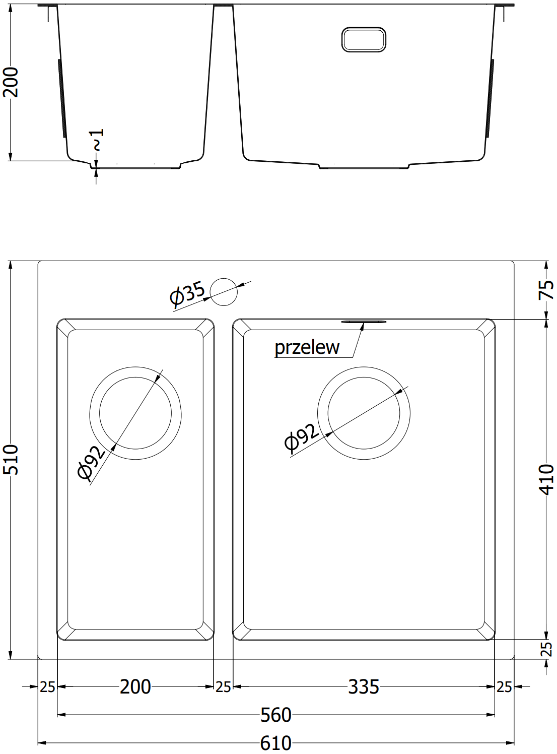 Dimensions de la cuve : 410x335 mm (grande), 410x200 mm (petite)