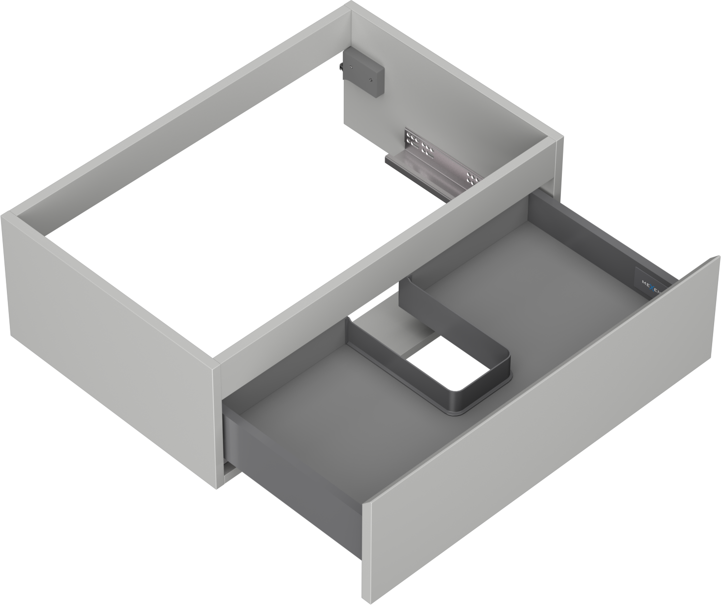 La découpe dans le tiroir est conçue de manière à accueillir le siphon, qui est nécessaire dans les installations de lavabo. Ainsi, le meuble peut être installé de manière pleinement fonctionnelle, sans devoir renoncer à l'espace du tiroir au profit de l'installation.