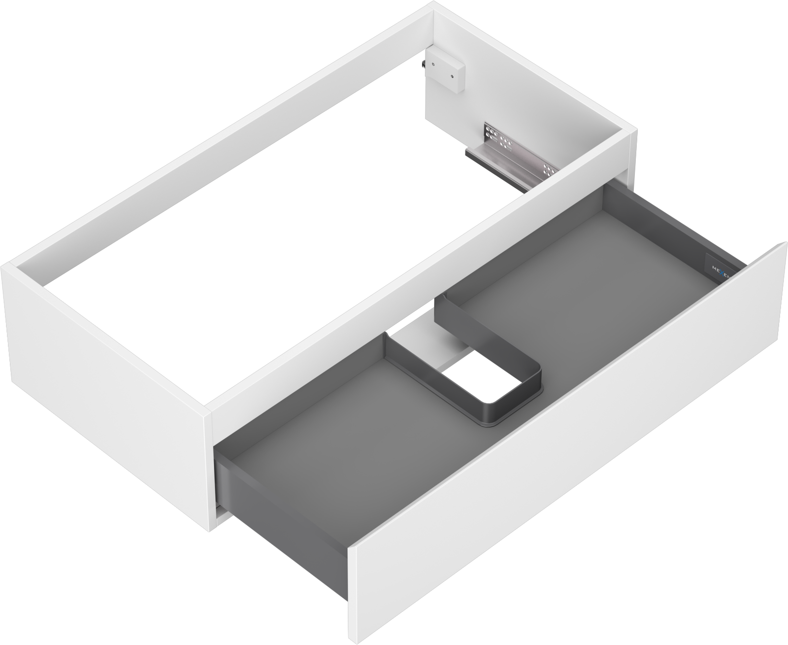 La découpe dans le tiroir est conçue de manière à accueillir le siphon, qui est nécessaire dans les installations de lavabo. Ainsi, le meuble peut être installé de manière pleinement fonctionnelle, sans devoir renoncer à l'espace du tiroir au profit de l'installation.