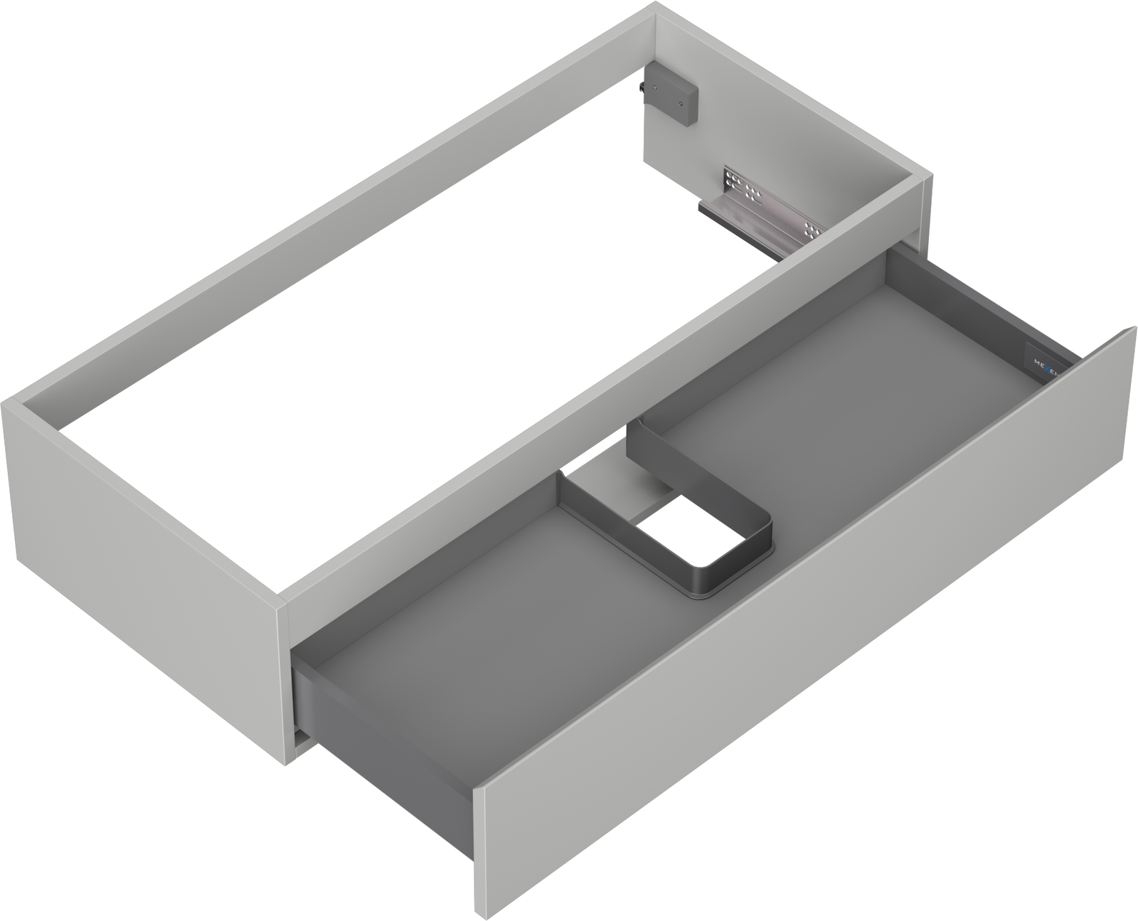 La découpe dans le tiroir est conçue de manière à accueillir le siphon, qui est nécessaire dans les installations de lavabo. Ainsi, le meuble peut être installé de manière pleinement fonctionnelle, sans devoir renoncer à l'espace du tiroir au profit de l'installation.