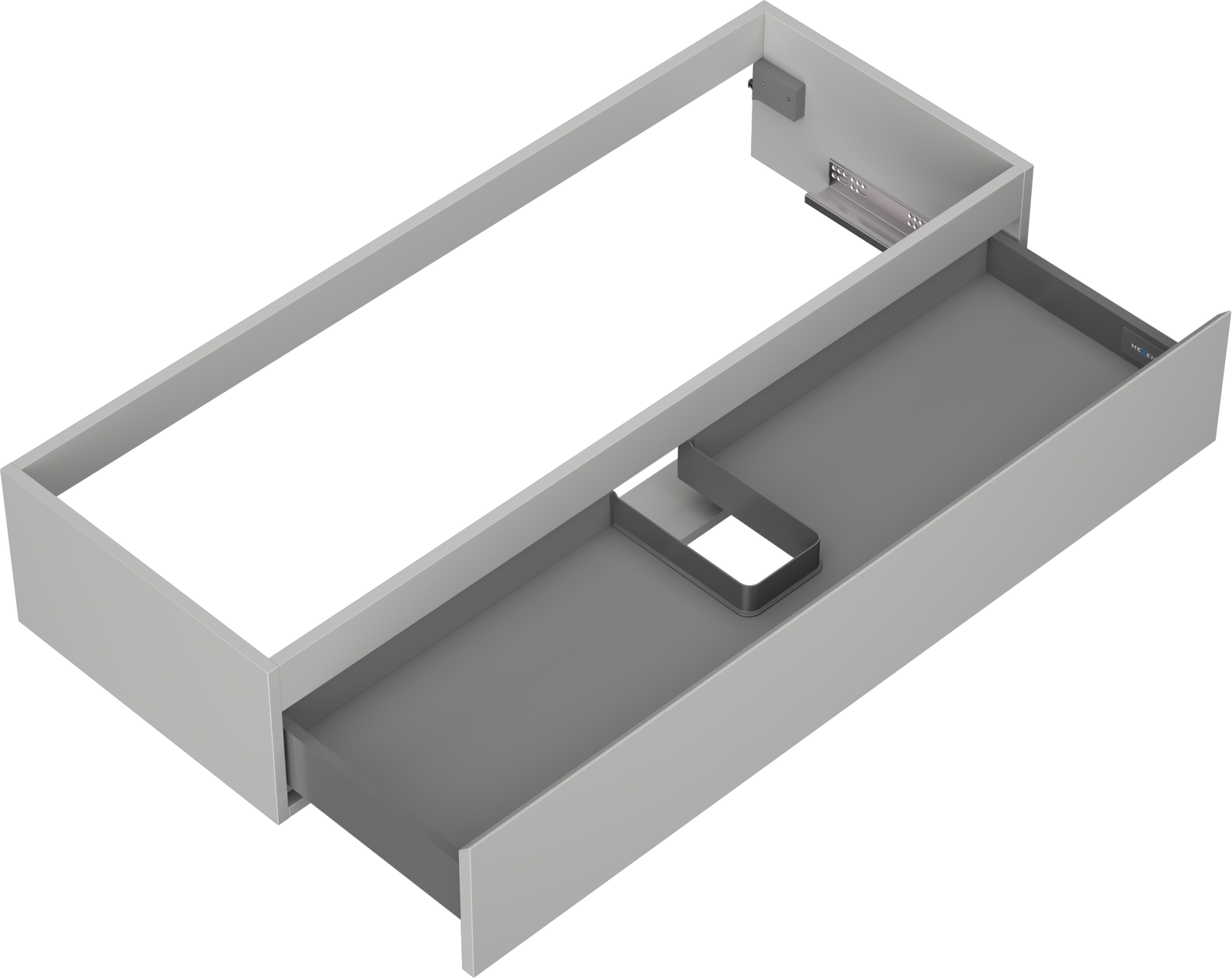 La découpe dans le tiroir est conçue de manière à accueillir le siphon, qui est nécessaire dans les installations de lavabo. Ainsi, le meuble peut être installé de manière pleinement fonctionnelle, sans devoir renoncer à l'espace du tiroir au profit de l'installation.
