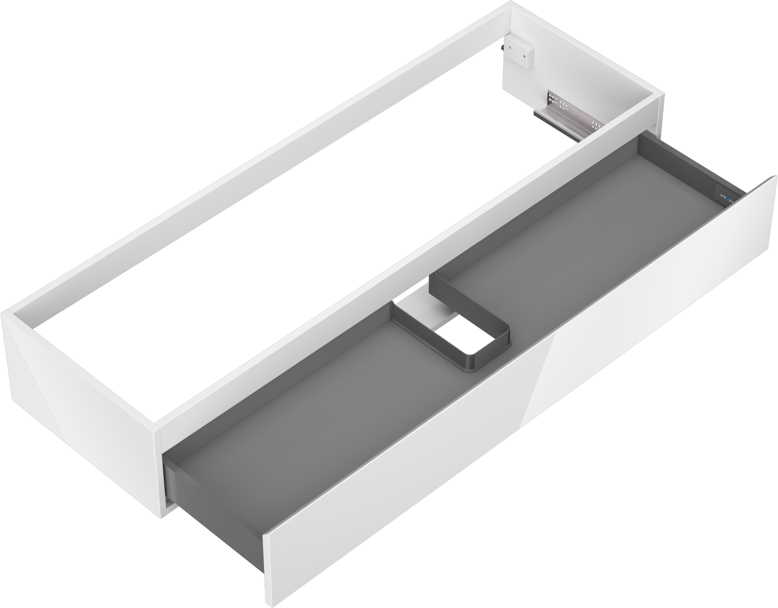 La découpe dans le tiroir est conçue de manière à accueillir le siphon, qui est nécessaire dans les installations de lavabo. Ainsi, le meuble peut être installé de manière pleinement fonctionnelle, sans devoir renoncer à l'espace du tiroir au profit de l'installation.