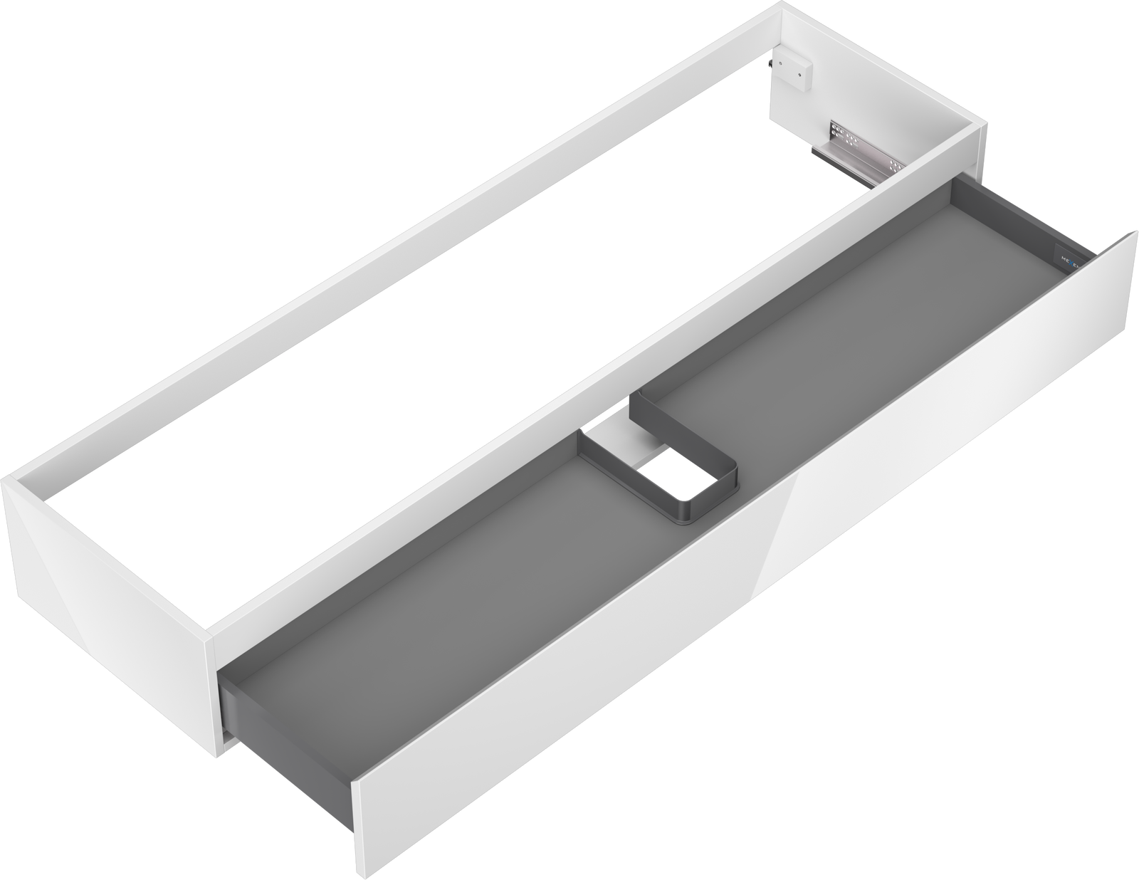 La découpe dans le tiroir est conçue de manière à accueillir le siphon, qui est nécessaire dans les installations de lavabo. Ainsi, le meuble peut être installé de manière pleinement fonctionnelle, sans devoir renoncer à l'espace du tiroir au profit de l'installation.