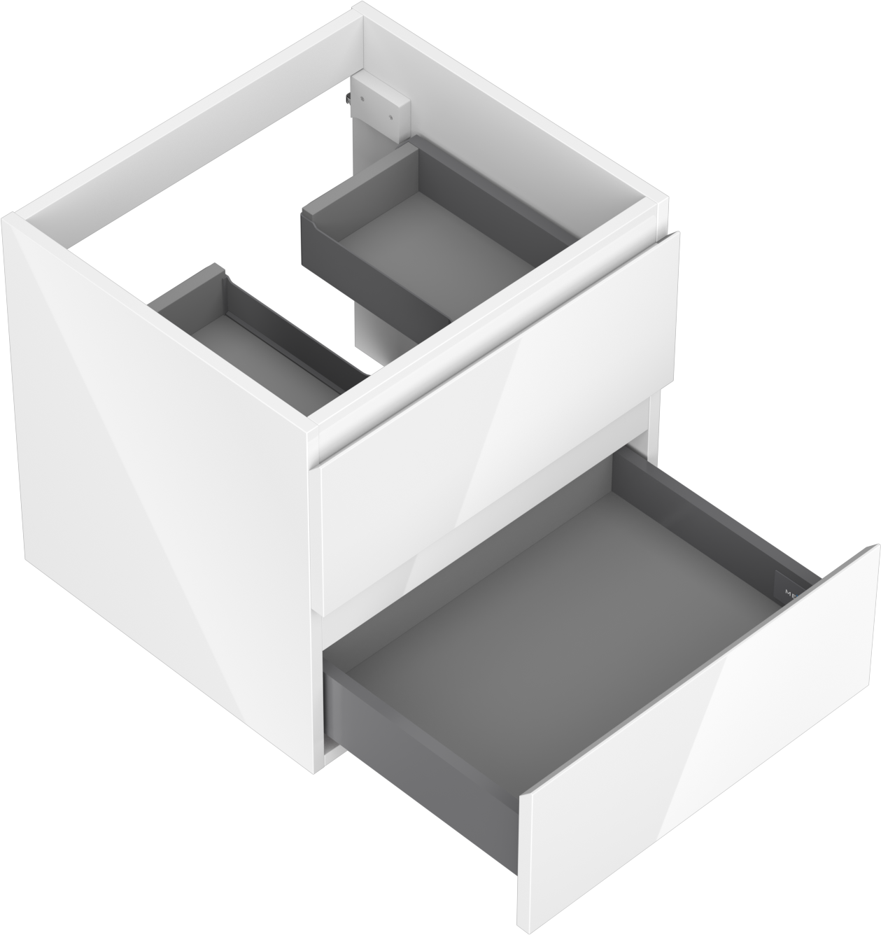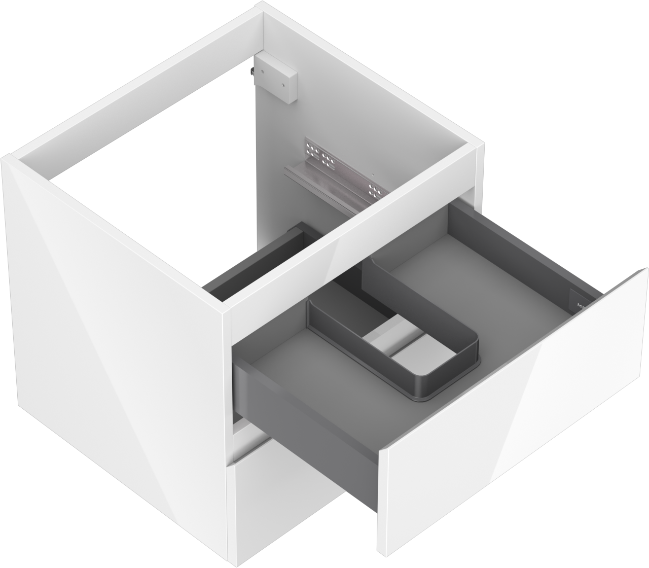 La découpe dans le tiroir est conçue de manière à accueillir le siphon, qui est nécessaire dans les installations de lavabo. Ainsi, le meuble peut être installé de manière pleinement fonctionnelle, sans devoir renoncer à l'espace du tiroir au profit de l'installation.