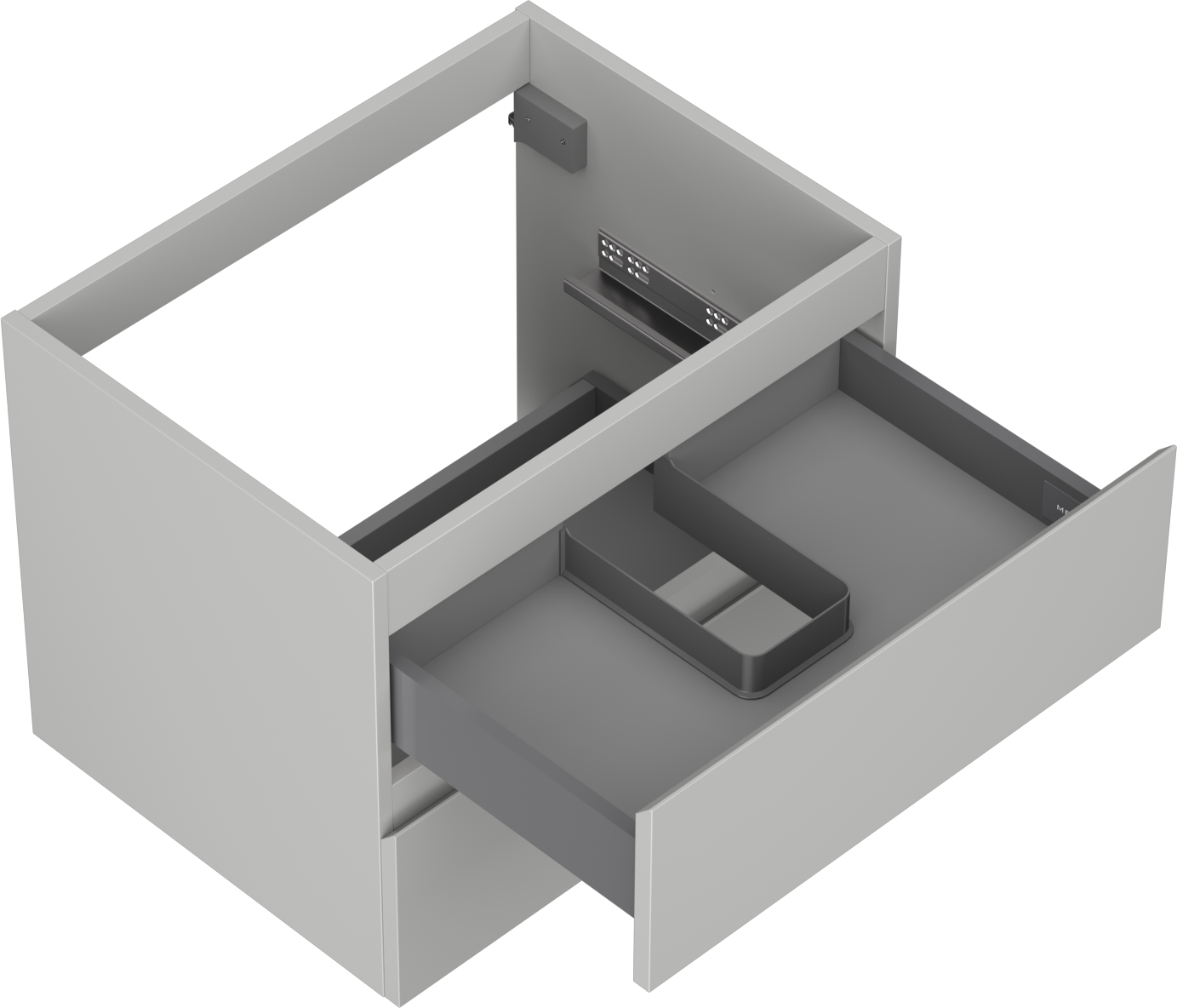 La découpe dans le tiroir est conçue de manière à accueillir le siphon, qui est nécessaire dans les installations de lavabo. Ainsi, le meuble peut être installé de manière pleinement fonctionnelle, sans devoir renoncer à l'espace du tiroir au profit de l'installation.