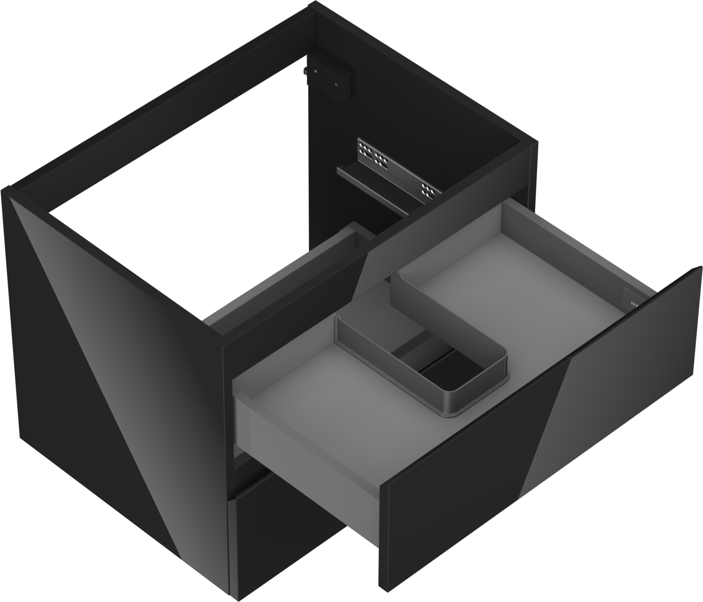 La découpe dans le tiroir est conçue de manière à accueillir le siphon, qui est nécessaire dans les installations de lavabo. Ainsi, le meuble peut être installé de manière pleinement fonctionnelle, sans devoir renoncer à l'espace du tiroir au profit de l'installation.