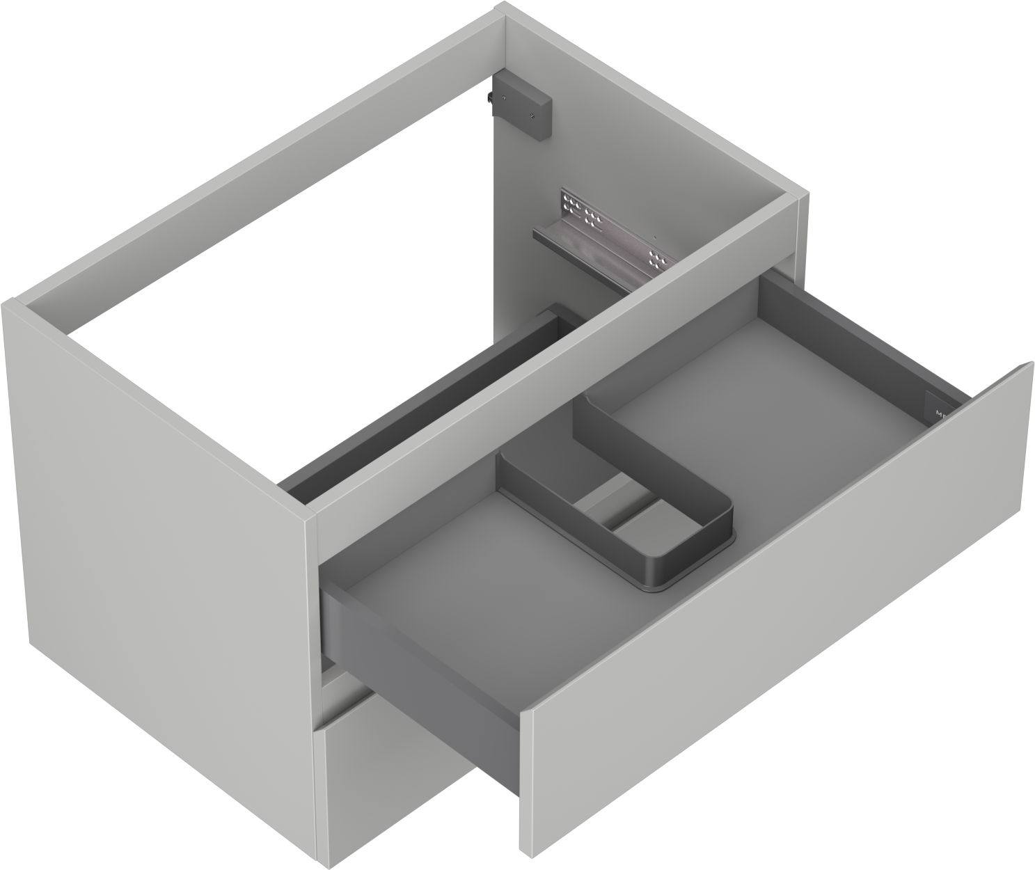 La découpe dans le tiroir est conçue de manière à accueillir le siphon, qui est nécessaire dans les installations de lavabo. Ainsi, le meuble peut être installé de manière pleinement fonctionnelle, sans devoir renoncer à l'espace du tiroir au profit de l'installation.
