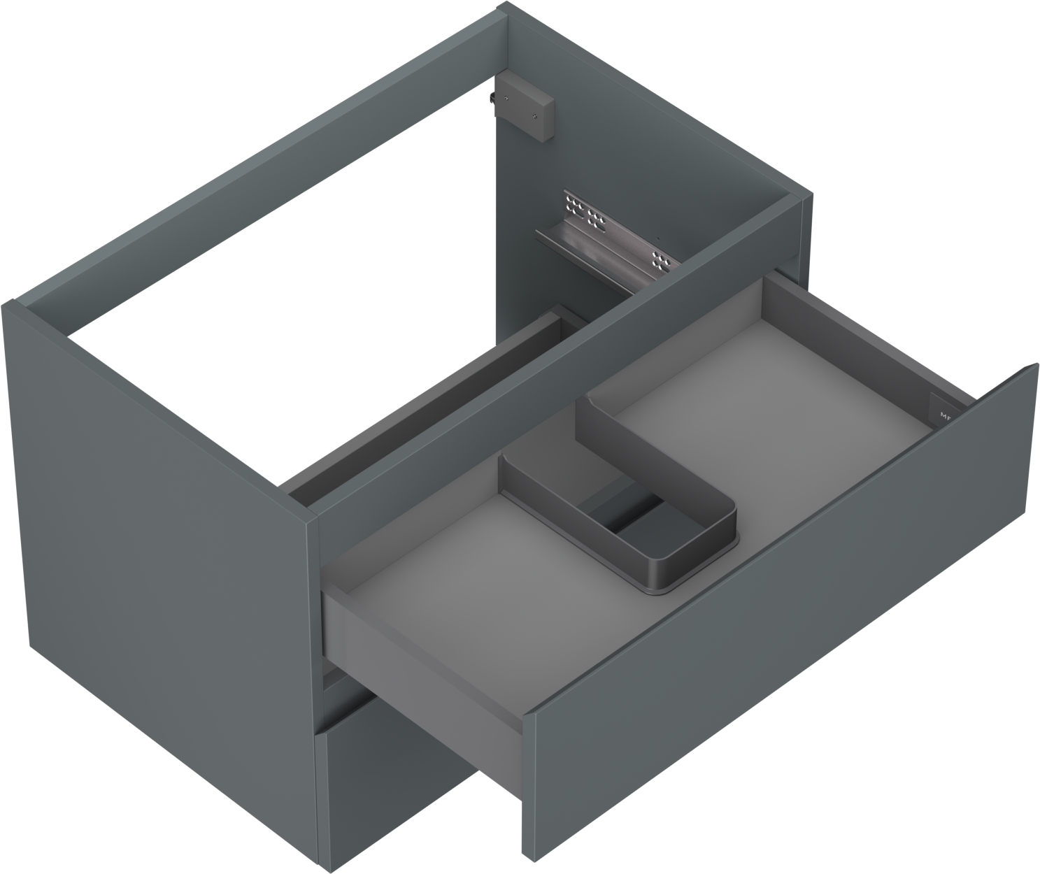 La découpe dans le tiroir est conçue de manière à accueillir le siphon, qui est nécessaire dans les installations de lavabo. Ainsi, le meuble peut être installé de manière pleinement fonctionnelle, sans devoir renoncer à l'espace du tiroir au profit de l'installation.
