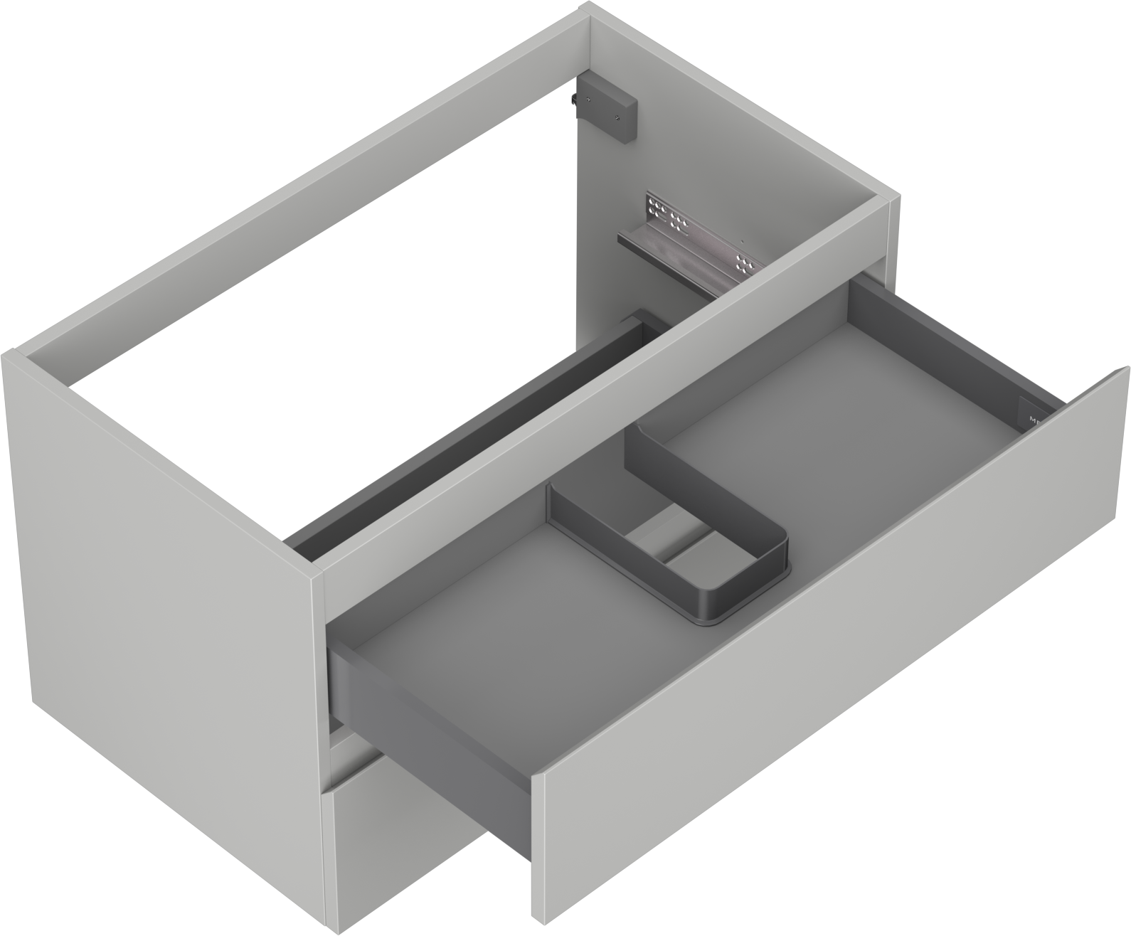 La découpe dans le tiroir est conçue de manière à accueillir le siphon, qui est nécessaire dans les installations de lavabo. Ainsi, le meuble peut être installé de manière pleinement fonctionnelle, sans devoir renoncer à l'espace du tiroir au profit de l'installation.