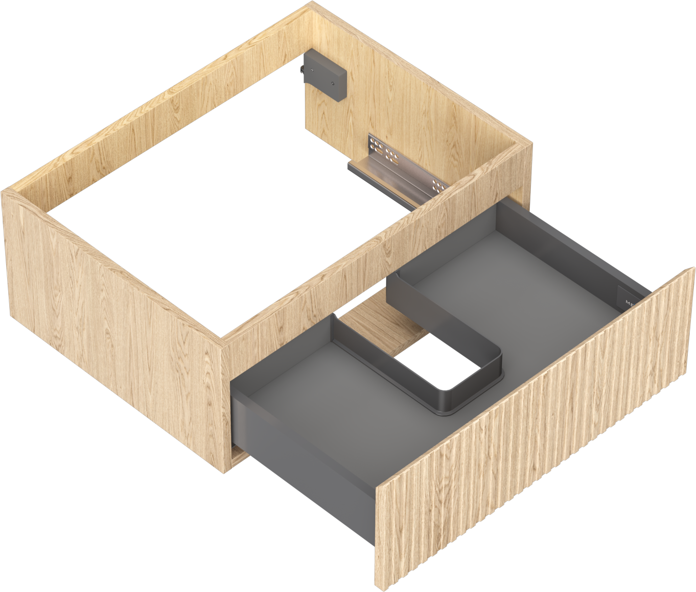 La découpe dans le tiroir est conçue de manière à accueillir le siphon, qui est nécessaire dans les installations de lavabo. Ainsi, le meuble peut être installé de manière pleinement fonctionnelle, sans devoir renoncer à l'espace du tiroir au profit de l'installation.