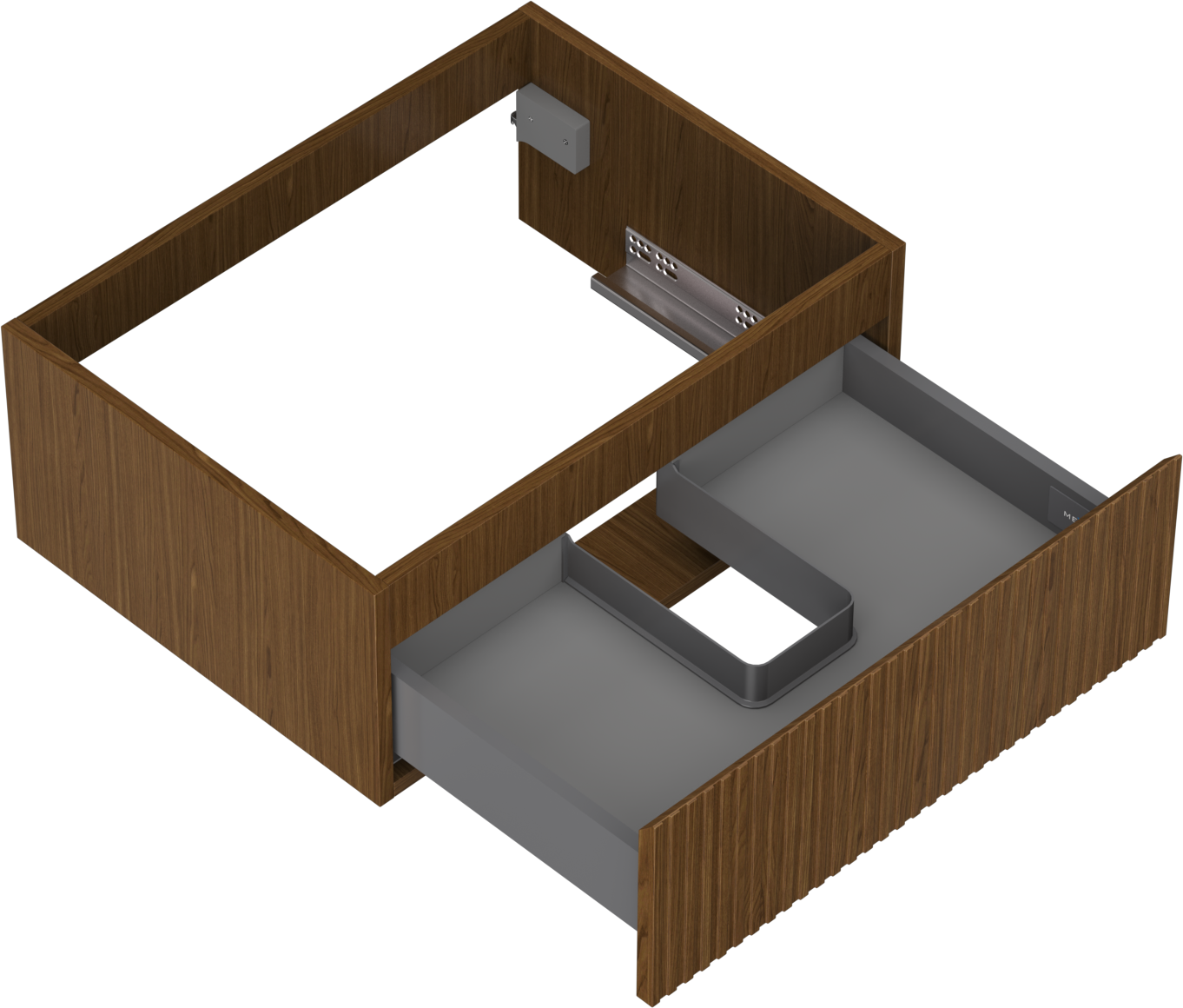 La découpe dans le tiroir est conçue de manière à accueillir le siphon, qui est nécessaire dans les installations de lavabo. Ainsi, le meuble peut être installé de manière pleinement fonctionnelle, sans devoir renoncer à l'espace du tiroir au profit de l'installation.