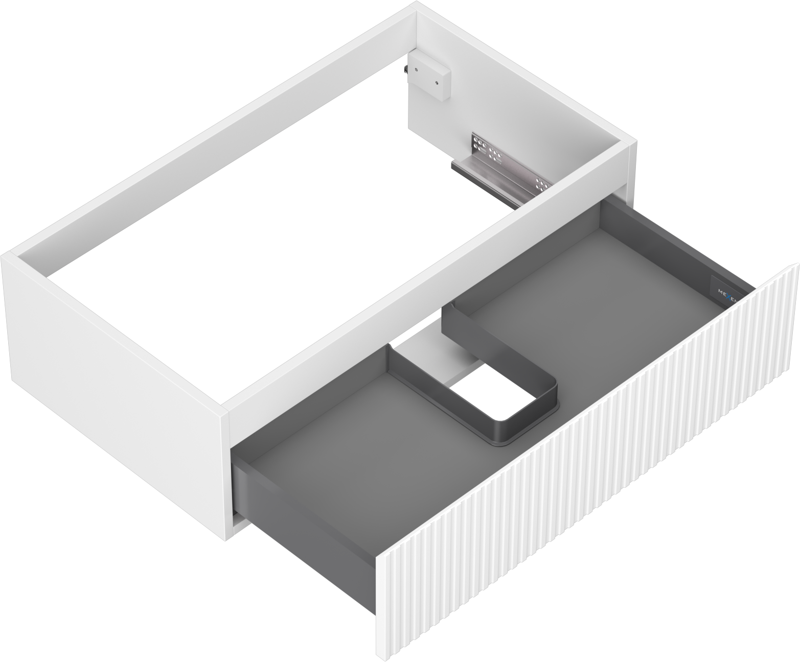 La découpe dans le tiroir est conçue de manière à accueillir le siphon, qui est nécessaire dans les installations de lavabo. Ainsi, le meuble peut être installé de manière pleinement fonctionnelle, sans devoir renoncer à l'espace du tiroir au profit de l'installation.