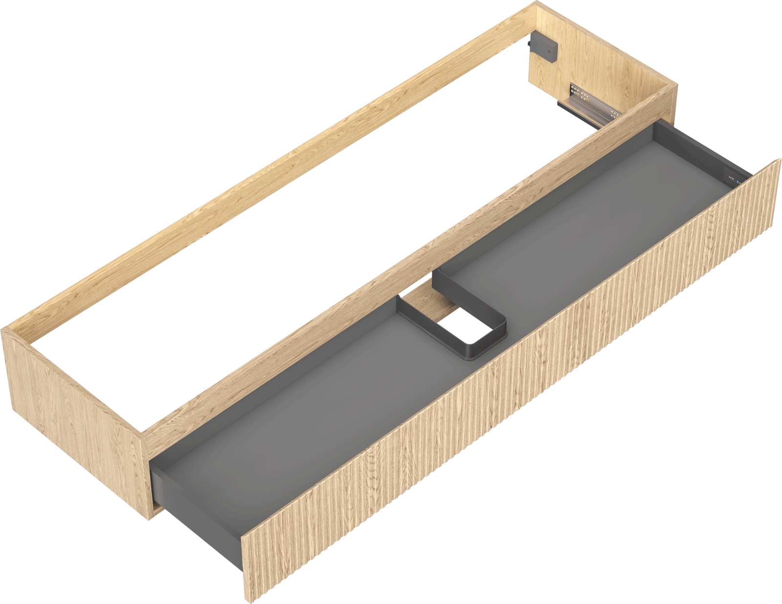 La découpe dans le tiroir est conçue de manière à accueillir le siphon, qui est nécessaire dans les installations de lavabo. Ainsi, le meuble peut être installé de manière pleinement fonctionnelle, sans devoir renoncer à l'espace du tiroir au profit de l'installation.