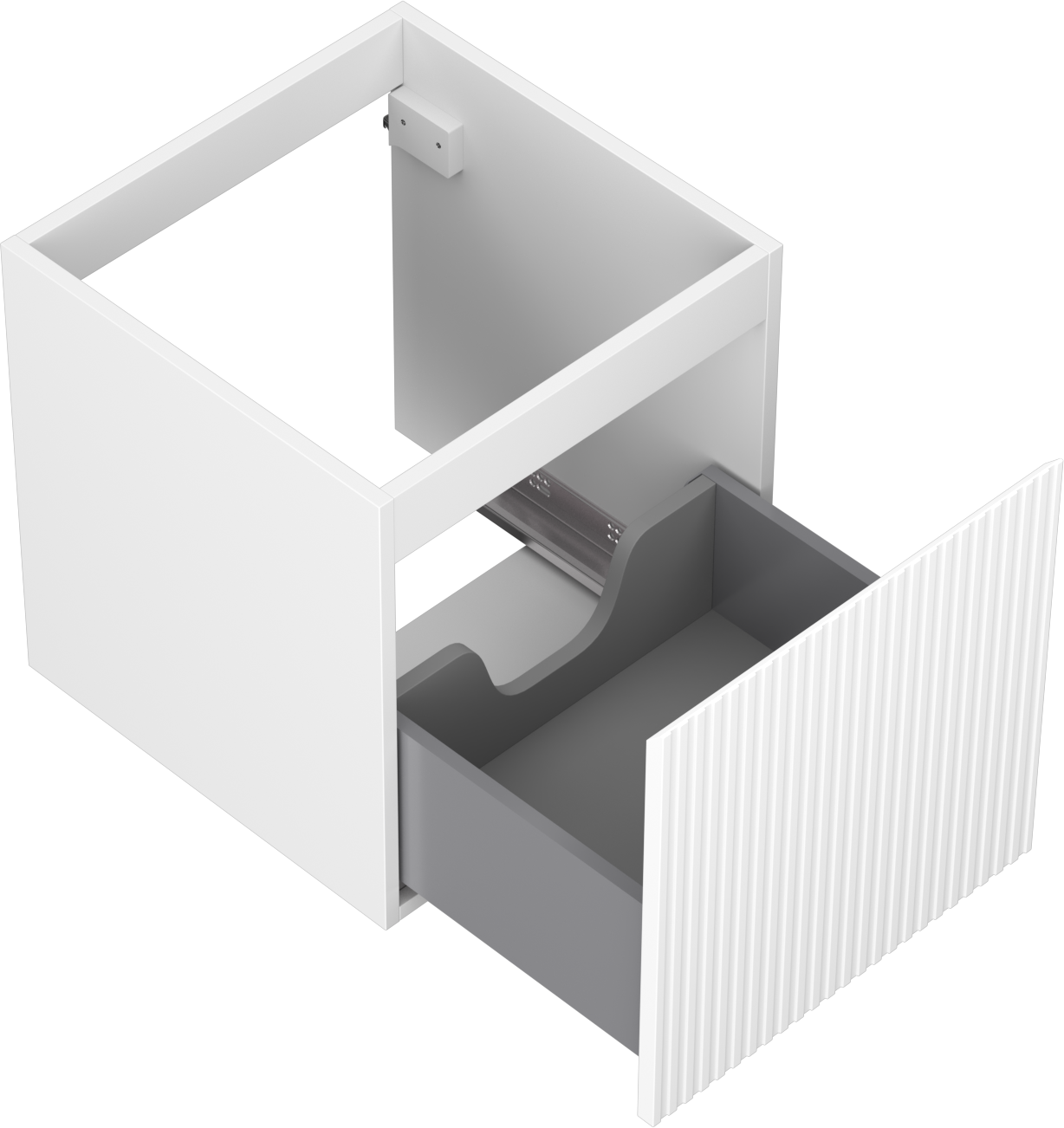 La découpe dans le tiroir est conçue de manière à accueillir le siphon, qui est nécessaire dans les installations de lavabo. Ainsi, le meuble peut être installé de manière pleinement fonctionnelle, sans devoir renoncer à l'espace du tiroir au profit de l'installation.