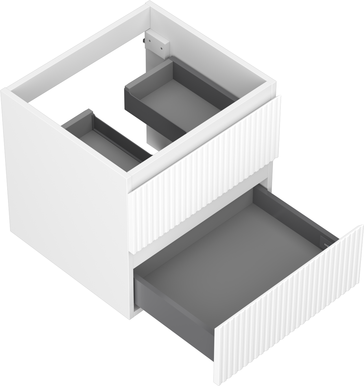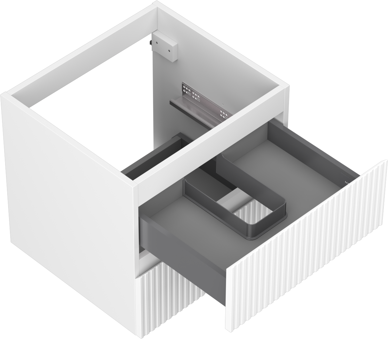 La découpe dans le tiroir est conçue de manière à accueillir le siphon, qui est nécessaire dans les installations de lavabo. Ainsi, le meuble peut être installé de manière pleinement fonctionnelle, sans devoir renoncer à l'espace du tiroir au profit de l'installation.