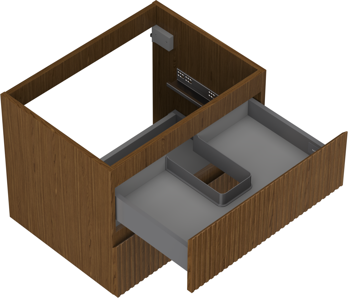 La découpe dans le tiroir est conçue de manière à accueillir le siphon, qui est nécessaire dans les installations de lavabo. Ainsi, le meuble peut être installé de manière pleinement fonctionnelle, sans devoir renoncer à l'espace du tiroir au profit de l'installation.