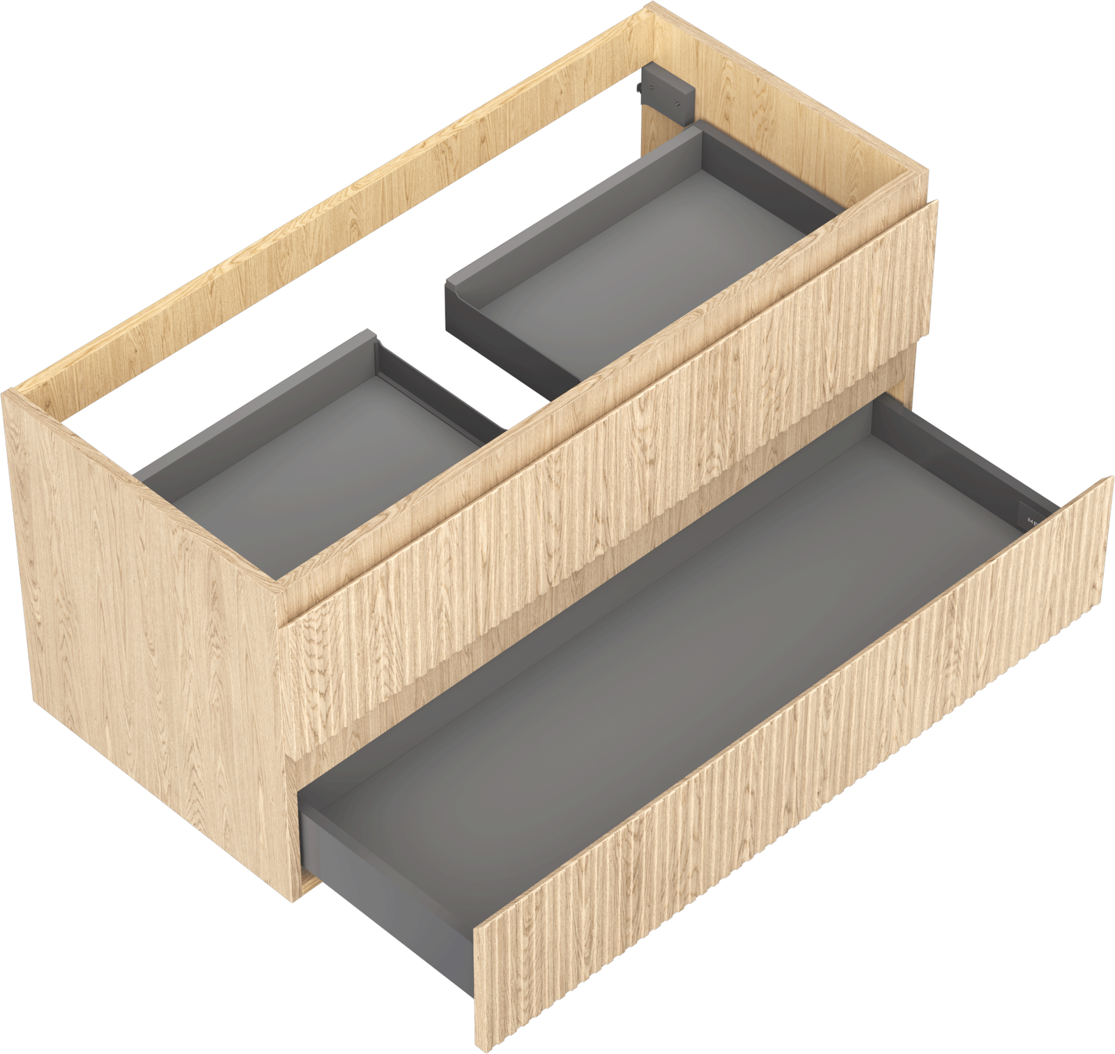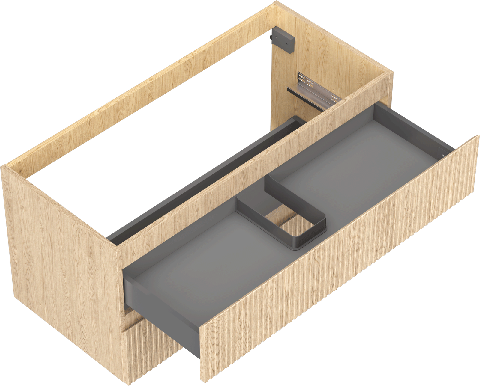 La découpe dans le tiroir est conçue de manière à accueillir le siphon, qui est nécessaire dans les installations de lavabo. Ainsi, le meuble peut être installé de manière pleinement fonctionnelle, sans devoir renoncer à l'espace du tiroir au profit de l'installation.
