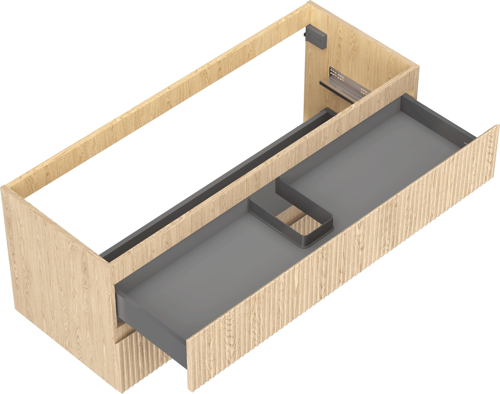 La découpe dans le tiroir est conçue de manière à accueillir le siphon, qui est nécessaire dans les installations de lavabo. Ainsi, le meuble peut être installé de manière pleinement fonctionnelle, sans devoir renoncer à l'espace du tiroir au profit de l'installation.