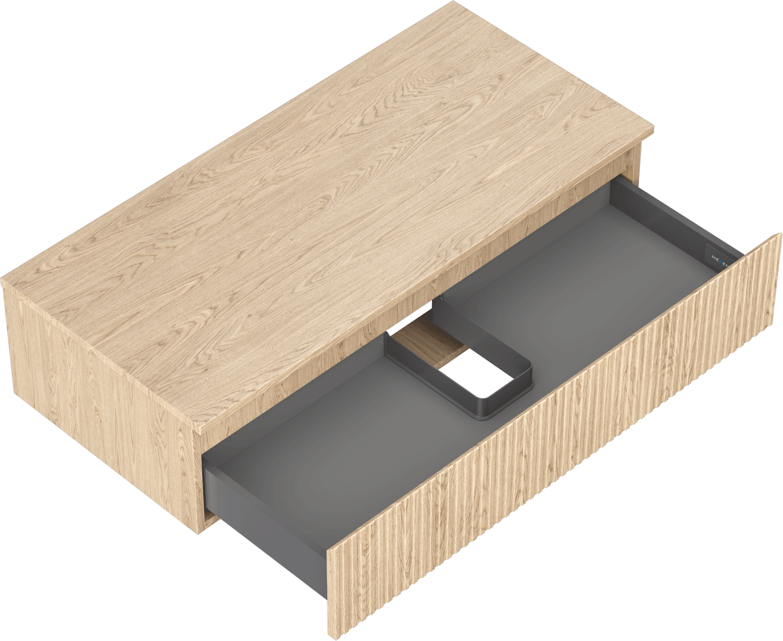 La découpe dans le tiroir est conçue de manière à accueillir le siphon, qui est nécessaire dans les installations de lavabo. Ainsi, le meuble peut être installé de manière pleinement fonctionnelle, sans devoir renoncer à l'espace du tiroir au profit de l'installation.