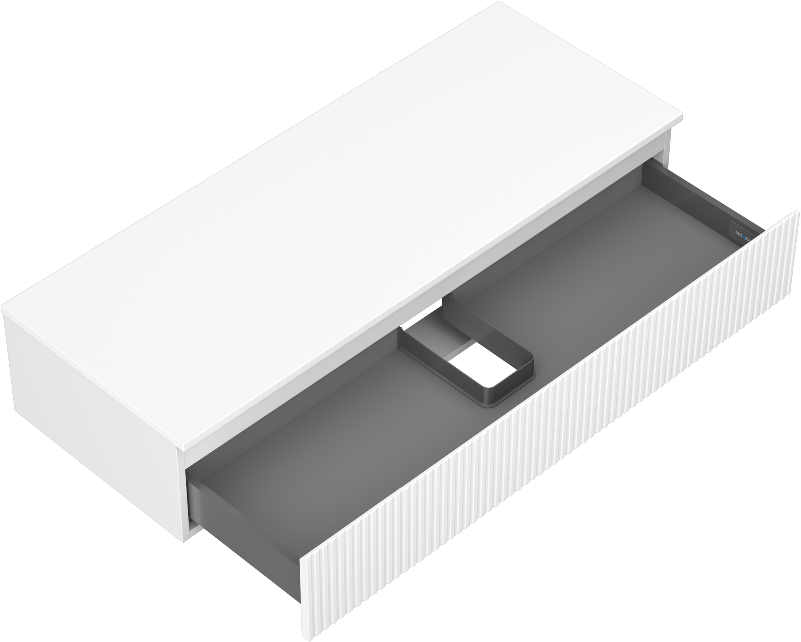 La découpe dans le tiroir est conçue de manière à accueillir le siphon, qui est nécessaire dans les installations de lavabo. Ainsi, le meuble peut être installé de manière pleinement fonctionnelle, sans devoir renoncer à l'espace du tiroir au profit de l'installation.
