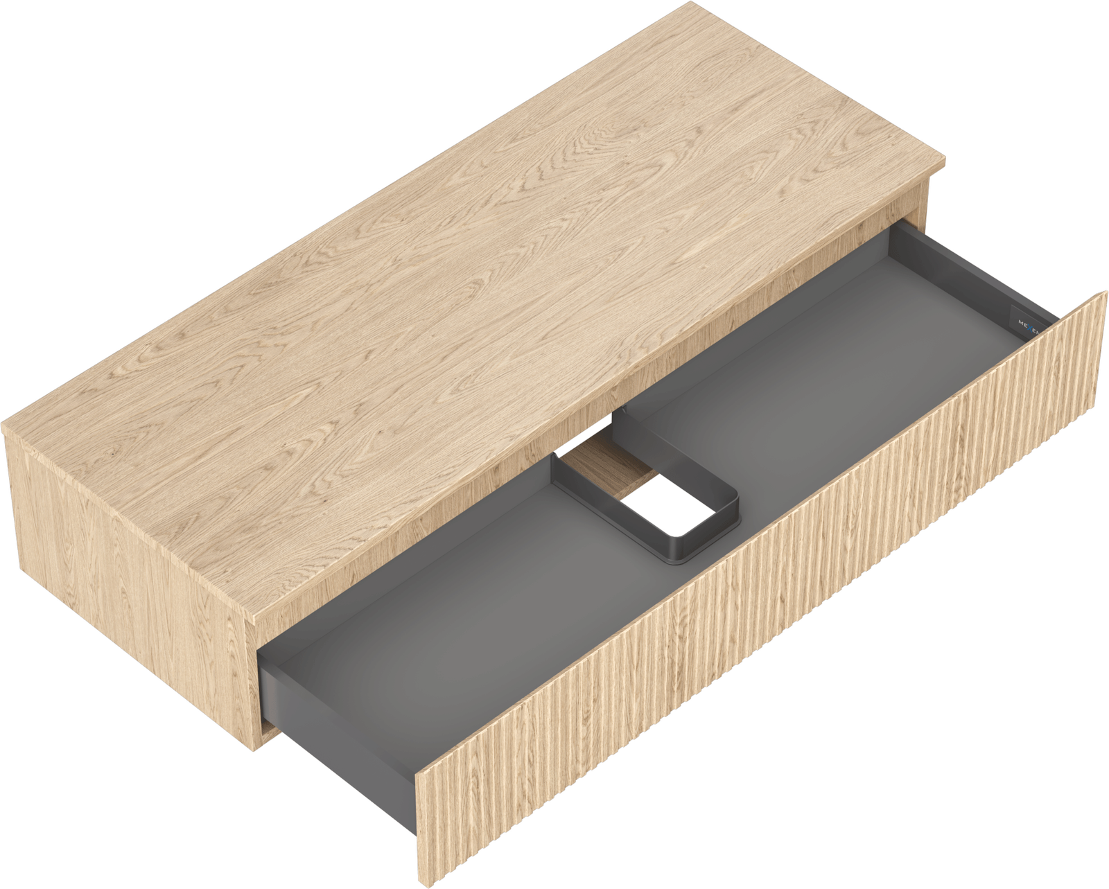 La découpe dans le tiroir est conçue de manière à accueillir le siphon, qui est nécessaire dans les installations de lavabo. Ainsi, le meuble peut être installé de manière pleinement fonctionnelle, sans devoir renoncer à l'espace du tiroir au profit de l'installation.