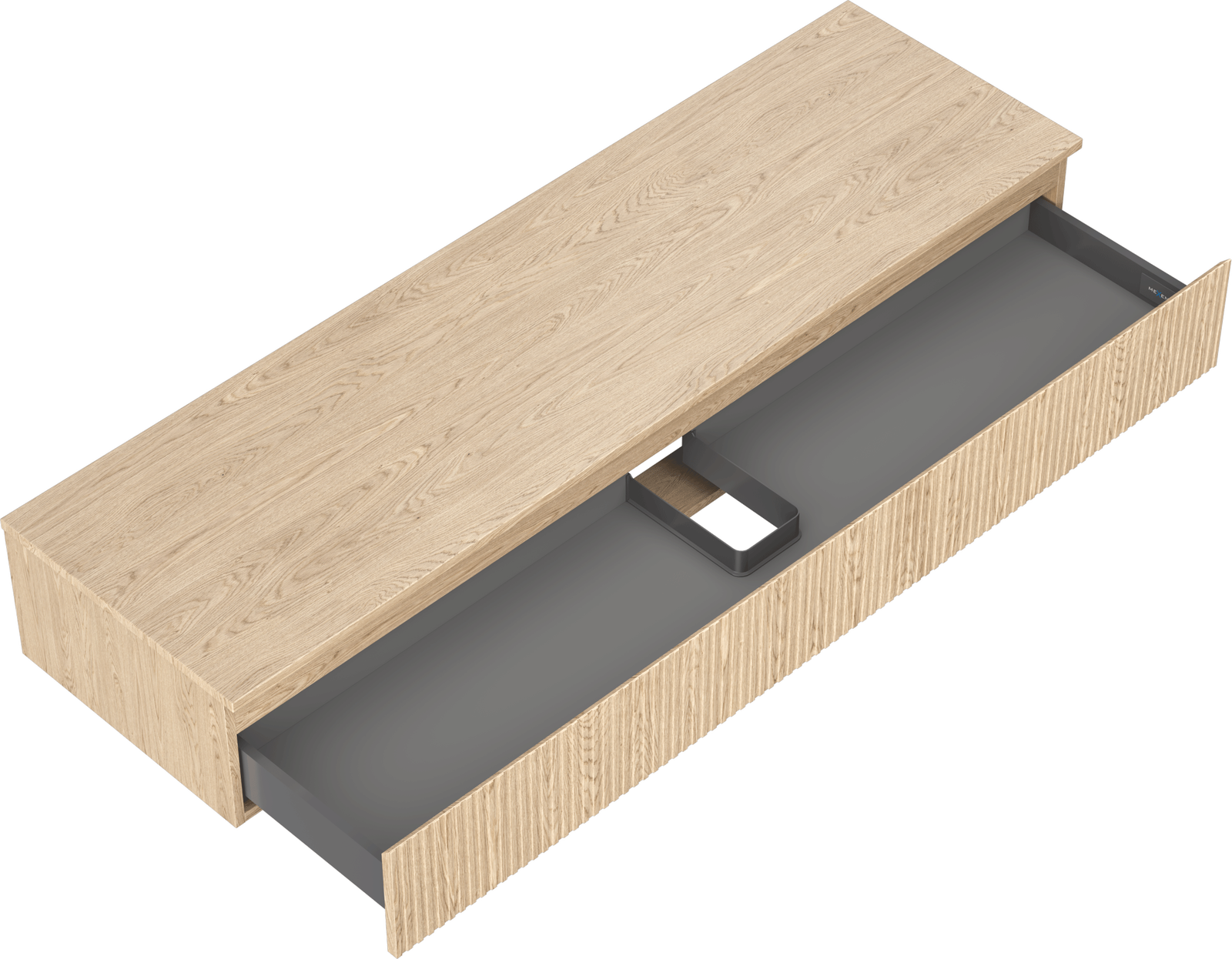 La découpe dans le tiroir est conçue de manière à accueillir le siphon, qui est nécessaire dans les installations de lavabo. Ainsi, le meuble peut être installé de manière pleinement fonctionnelle, sans devoir renoncer à l'espace du tiroir au profit de l'installation.