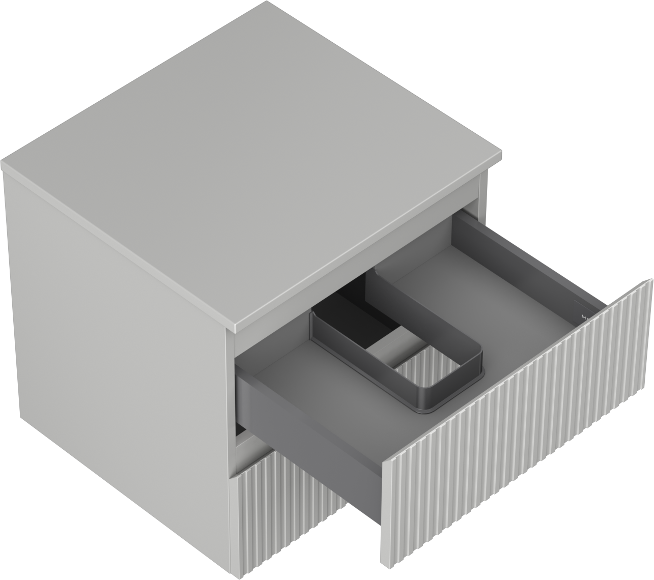 La découpe dans le tiroir est conçue de manière à accueillir le siphon, qui est nécessaire dans les installations de lavabo. Ainsi, le meuble peut être installé de manière pleinement fonctionnelle, sans devoir renoncer à l'espace du tiroir au profit de l'installation.