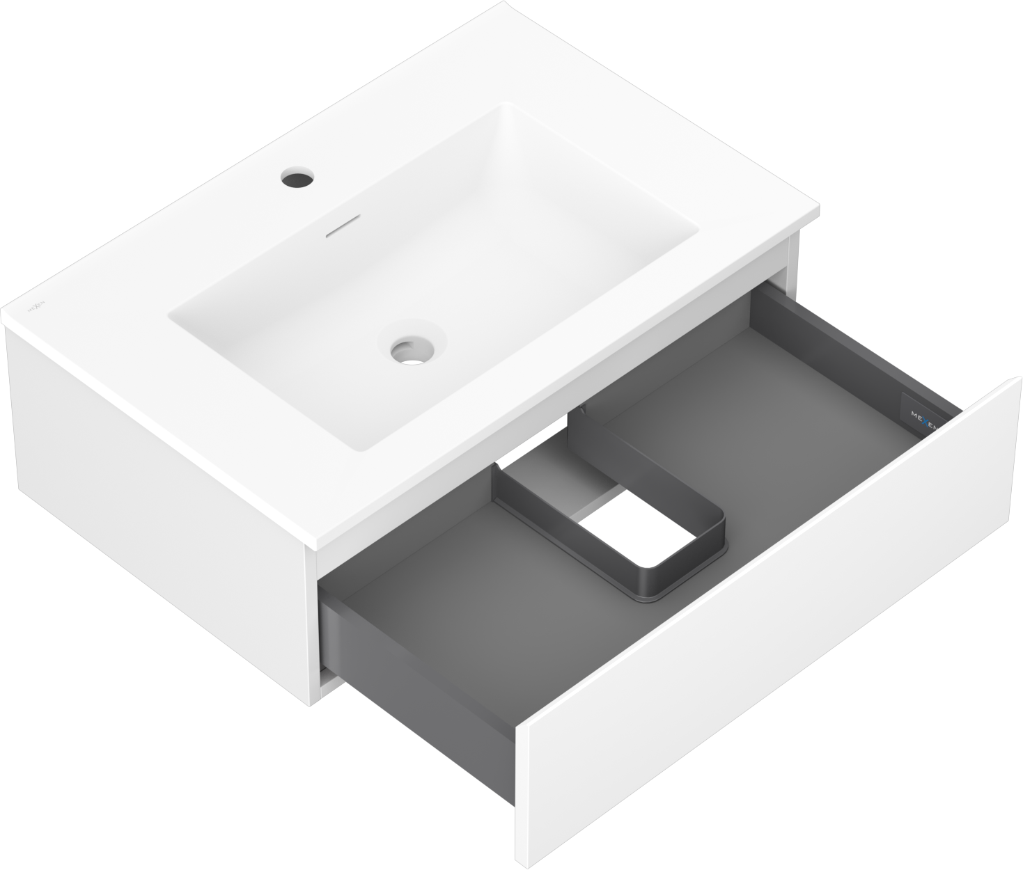 La découpe dans le tiroir est conçue de manière à accueillir le siphon, qui est nécessaire dans les installations de lavabo. Ainsi, le meuble peut être installé de manière pleinement fonctionnelle, sans devoir renoncer à l'espace du tiroir au profit de l'installation.
